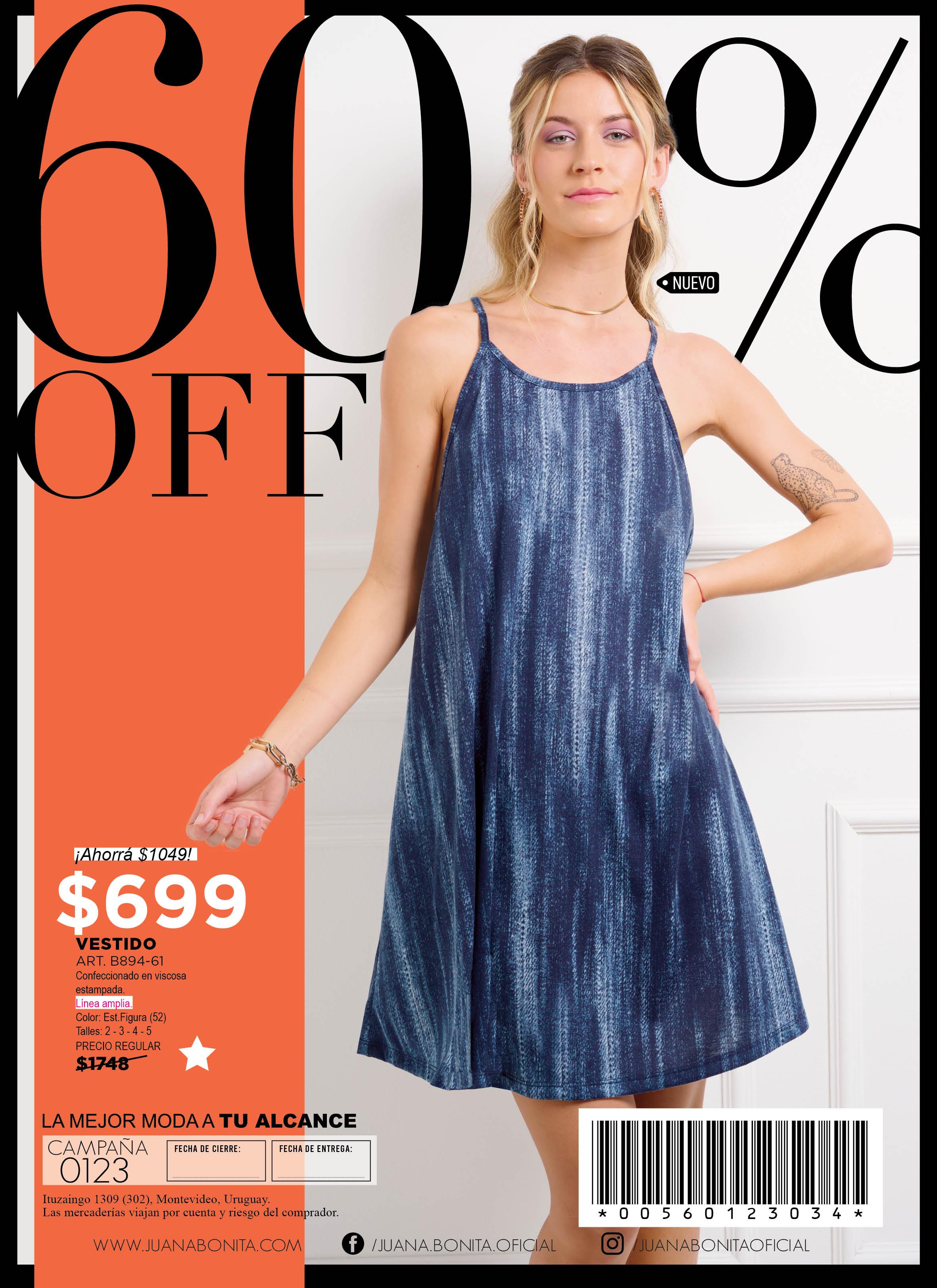 40% PRECIO REGULAR $1665 $999 ¡Ahorrá $666! VESTIDO ART. B335-61 Confeccionado en viscosa estampada con breteles negros. Línea clásica. Color: Bicolor (31) Talles: 1 - 2 - 3 - 4 215