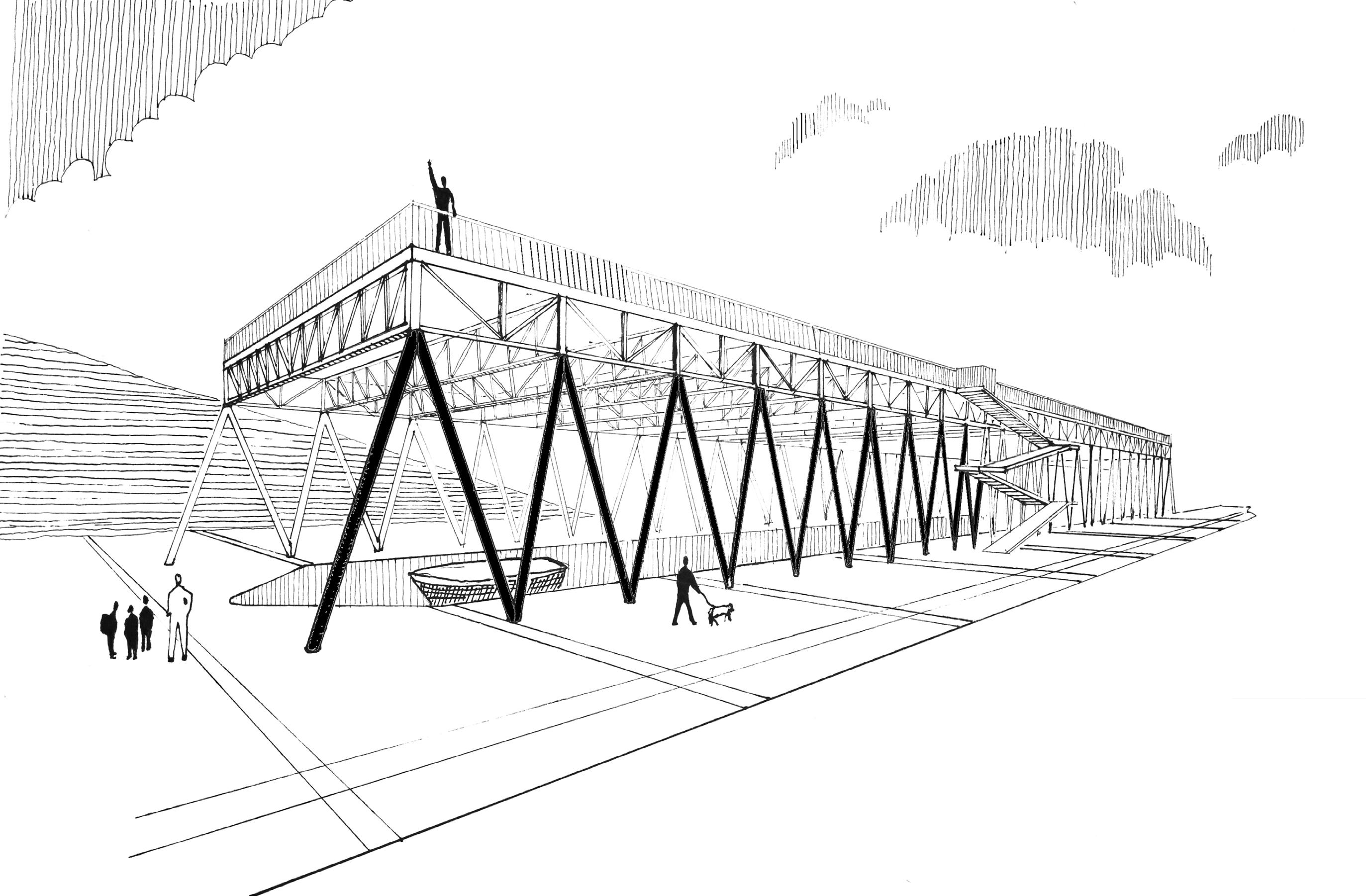 La zona deportiva se plantea enterrada, cubierta por una cercha metálica elevada que permite las miradas desde la cota de calle, la entrada de luz y la ventilación.