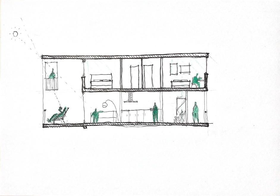 Se proyectan unas viviendas dúplex, generando un pasillo corrido que da acceso a las mismas. Las viviendas orientan los espacios de noche y salas de estar a sur, permitiendo las vistas hacia el mar. Por otro lado la cocina se plantea inmediatamente después de la entrada, en la fachada norte.