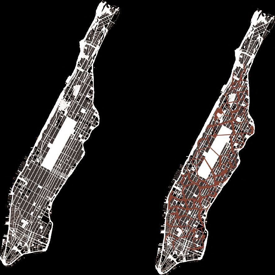 La supresión dimensional se produce al eliminar las estructuras escalantes de la urbanidad tradicional, utilizando un “solvente” que disuelve la forma física de lo urbano y distiende su estructura. Esto se logra a través de elementos interrelacionados que generan un superorden basado en la oblicuidad, permitiendo distorsionar e interpretar distancias de manera más dinámica. Este enfoque ofrece una forma más eficiente de recorrer el territorio, en contraste con la retícula ortogonal tradicional, que limita la circulación a una idea compositiva en lugar de responder a necesidades sistémicas.