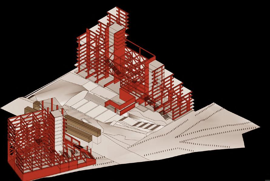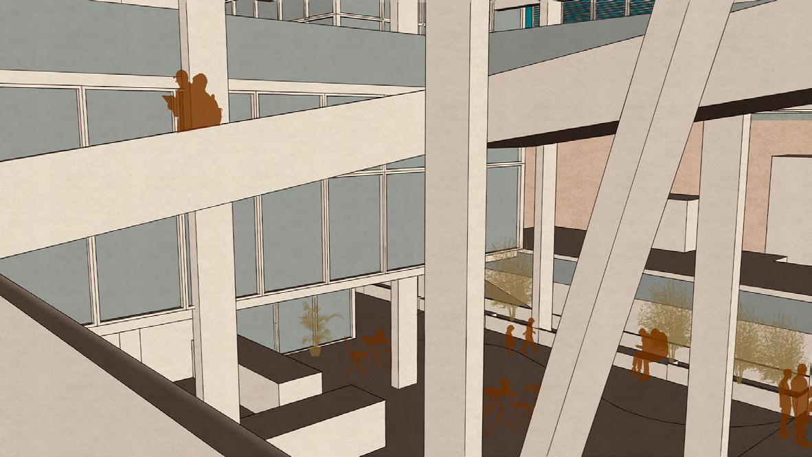 Complejo Hibrido Bicentenario tiene como objetivo cualificar los espacios libres a través de zócalos urbanos que conecten el espacio público con equipamientos clave. Se acondicionan las dinámicas del sector mediante puntos de concentración que fomentan la interacción social. La circulación entre los dos bloques se relaciona estrechamente con la Estación Bicentenario del Tranvía, integrando espacios a diferentes niveles. Desde la estación, se accede a una plaza soterrada que conduce al bloque norte y se asciende a través de escaleras hacia espacios públicos en altura. Estas conexiones enriquecen la experiencia urbana, promoviendo una comunidad más integrada y accesible.