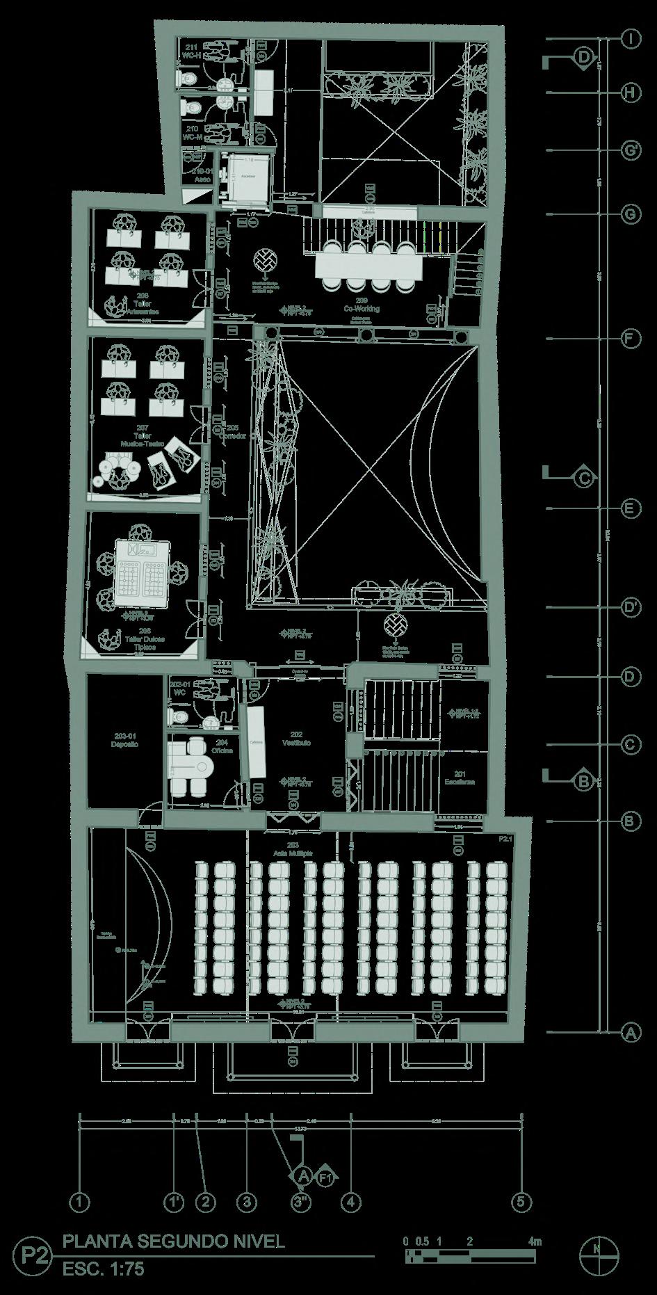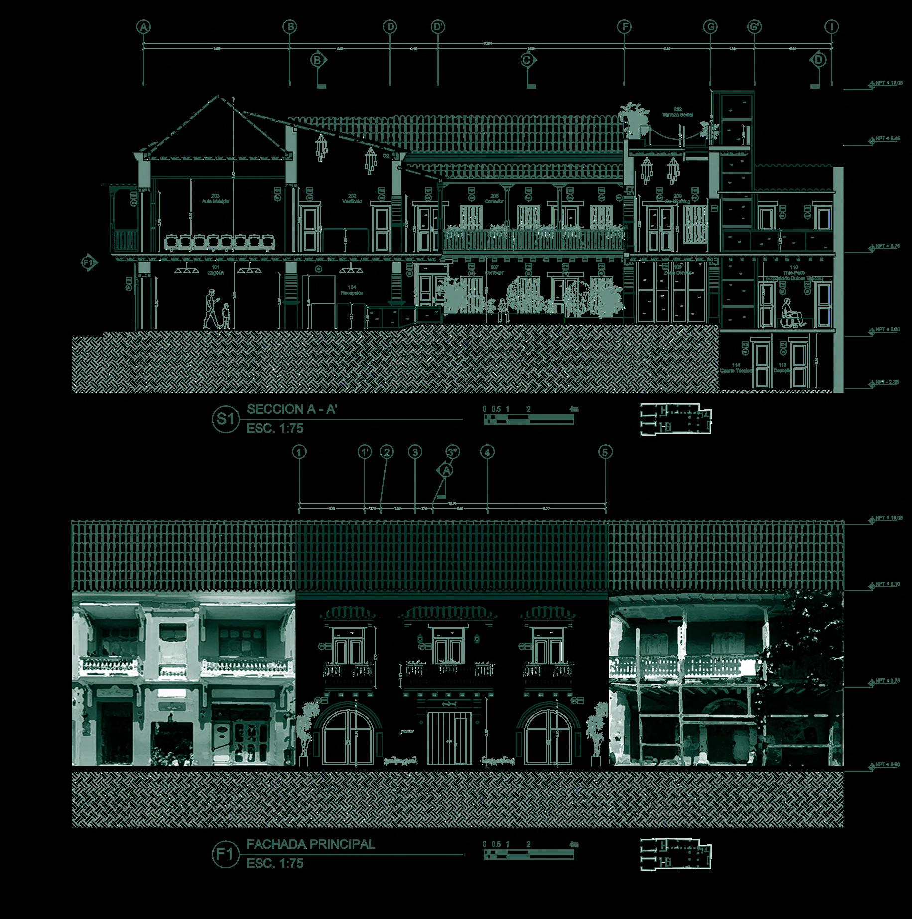 4. Se toma una perspectiva restauradora de intervención reversible en algunos espacios como lo es la Sala de Exposiciones a través de muros falsos en madera, y en el Aula Múltiple del salón principal a través de muros retráctiles.
