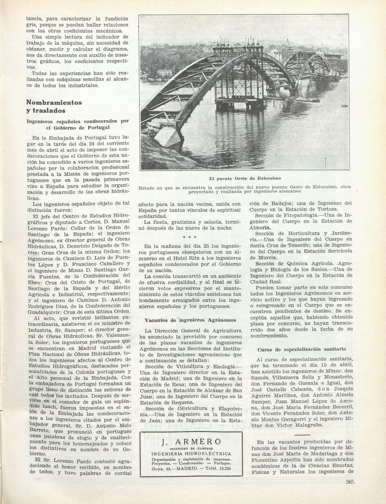 Han sido nombrados: don Federico Segarra, para la Delegación de los Servicios del Pirineo Oriental; don Manuel Díaz Ronda, jefe de Aguas de la del Segura; don José García Angustia, para la del Duero; don Carlos Robledo, para la del Segura; don Ramón Fontecha, para la Jefatura de Obras públicas de Segovia; don Agustín Redó, segundo jefe de Madrid; don Juan P Alcaraz, director interino del puerto de Denia; don Pablo Moreu, auxiliar de la Junta del Puerto de Barcelona; don Víctor Martin Gil, presidente del Consejo de Obras Hidráulicas; don Fernando Hué, consejero en el Consejo de Caminos, y don Diego Mayoral, en el de Obras Hidráulicas