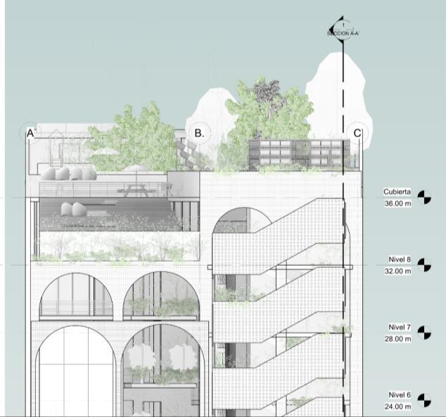 En las dos platas superiores, se disponen algunos vacíos en el centro del edificio para iluminar y ventilar, puesto que este sector del edifico no tiene relación directa con ninguna fachada la mejor manera de brindarle confort y calidad espacialesatravésdelucernariosenlacubierta.