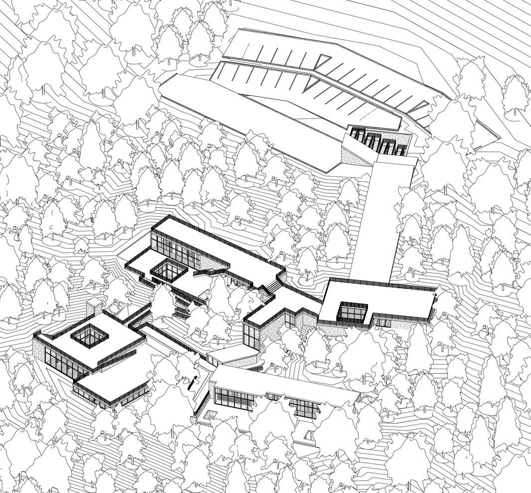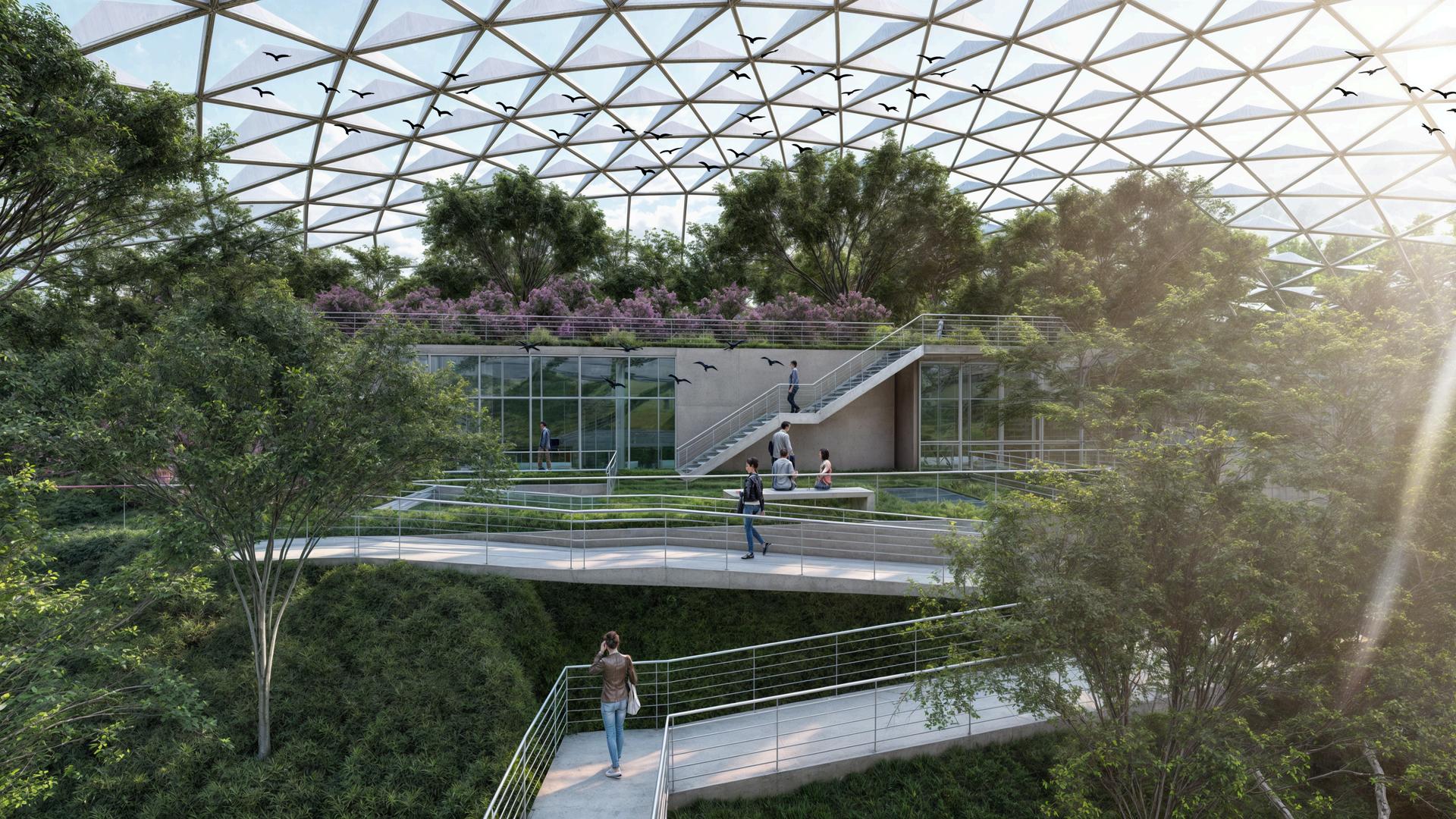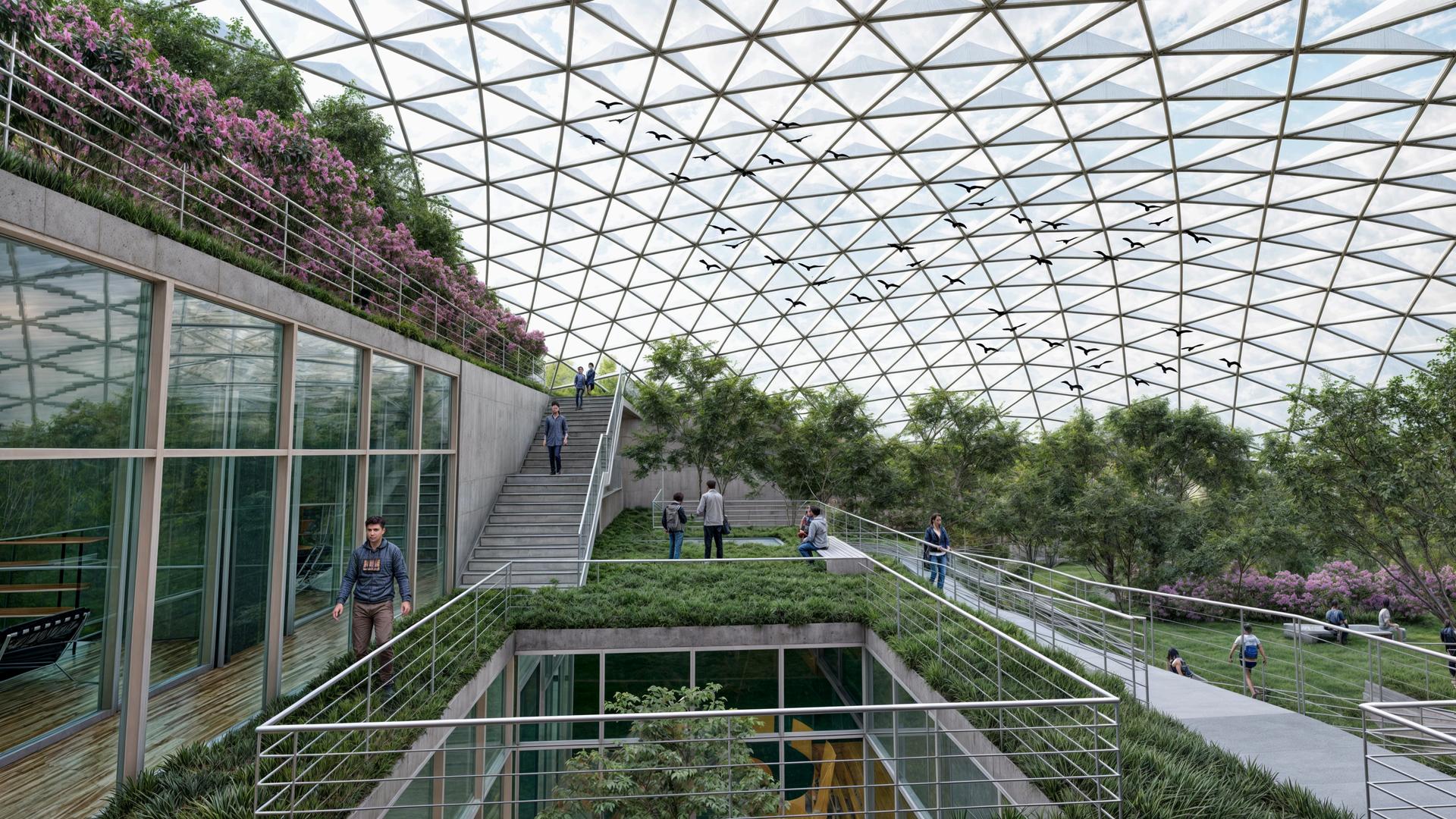Se priorizó la integración de elementos naturales del entorno, como la topografía escalonada y la orientación solar, para maximizar la eficiencia energética y confort global del proyecto. Se estableció un hábitat simbiótico entre aves y humanos, utilizando los techos del proyecto como recorridos dentro del aviario, algunos parcialmente enterrados para resaltar la prominencia de la cubierta, elemento central del diseño.