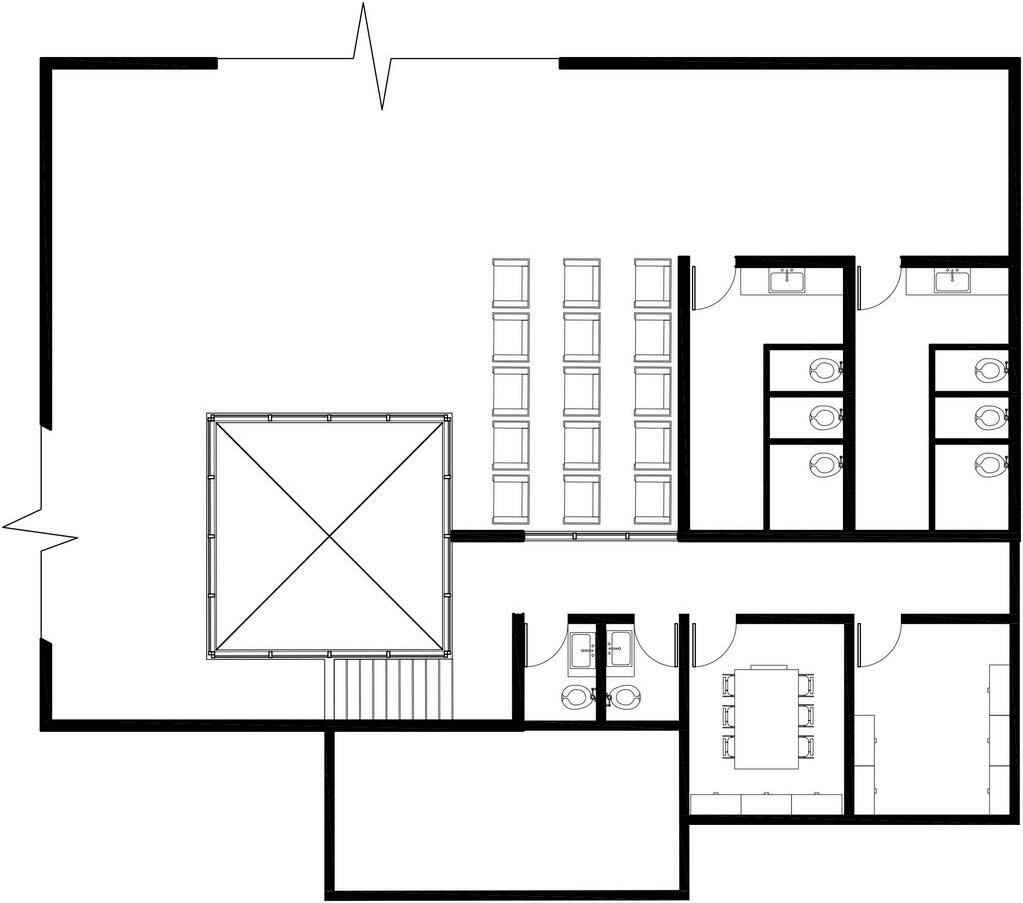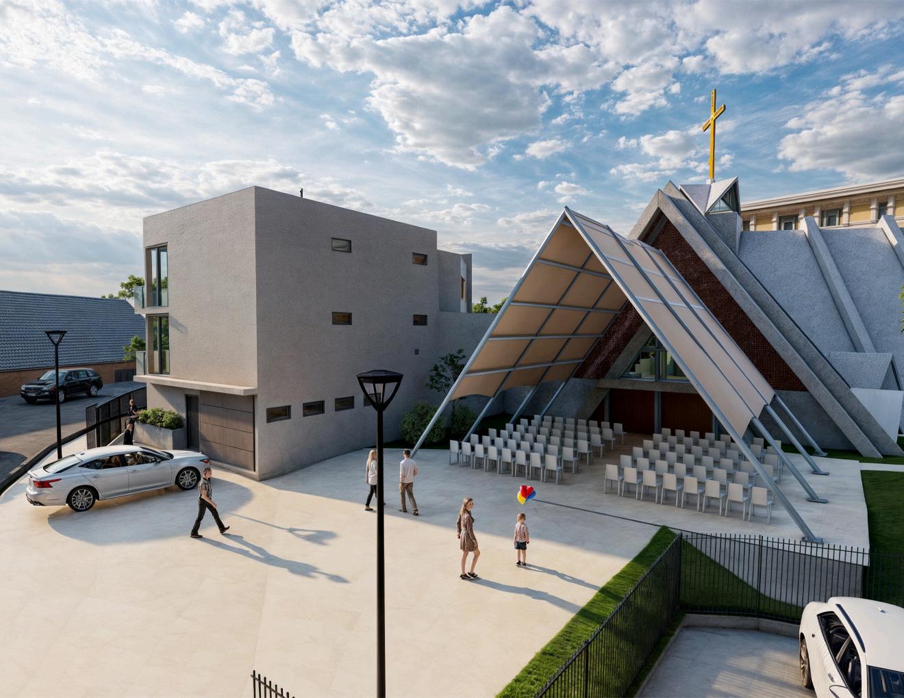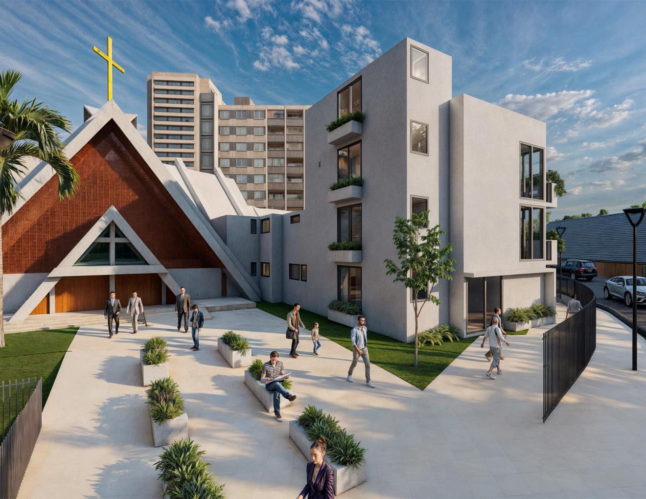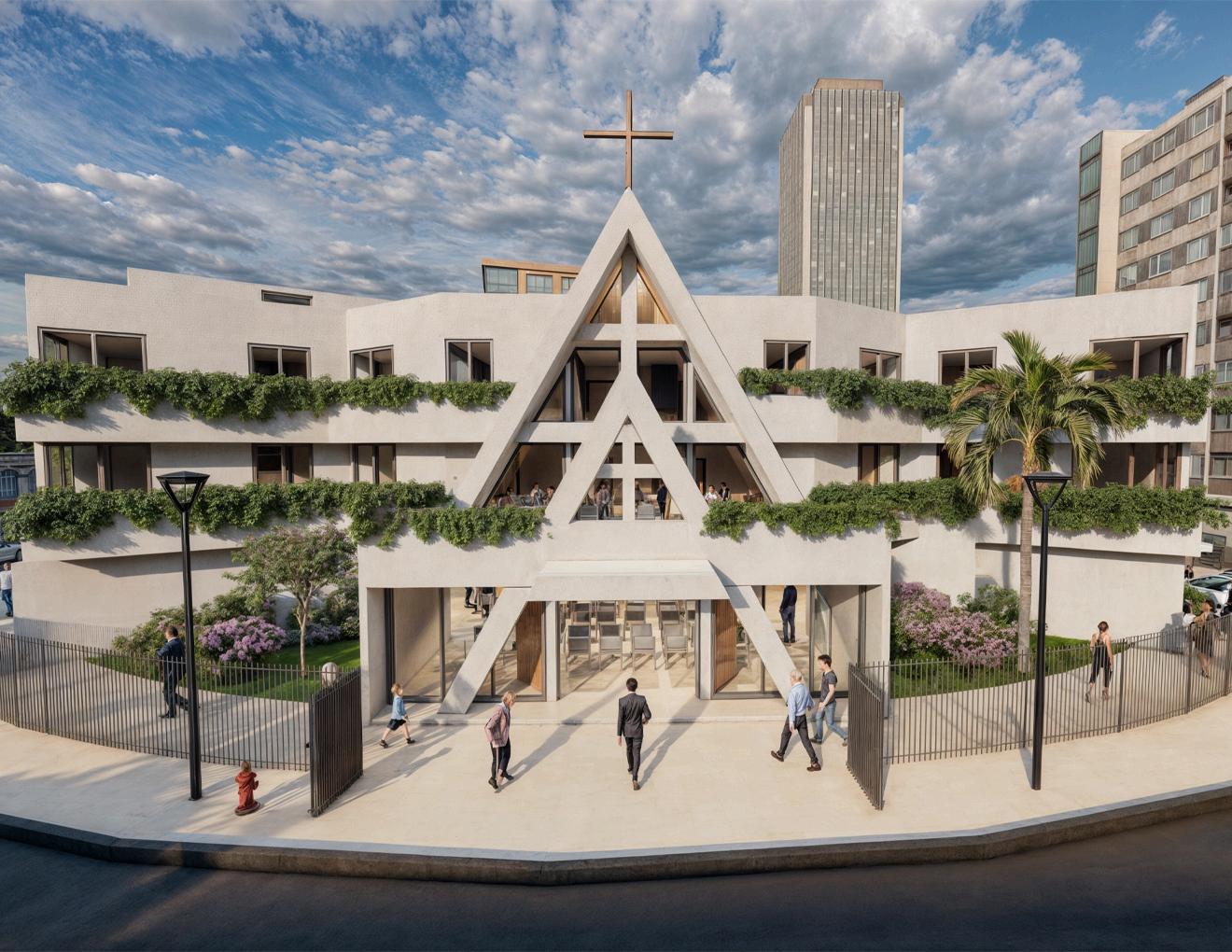 Dentro del proceso de diseño de la remodelación se buscó acoplarse al edificio existente, respetando el protagonismo de la iglesia, una entidad emblemática de la ciudad. La implementación de elementos triangulares dentro del diseño fue importante para respetar el lenguaje original del arquitecto y la identidad de este Vista en planta, el nuevo salón polivalente se incorpora a la iglesia formando la silueta de la cruz de San Benito, añadiendo valor religioso y cultural al sitio.