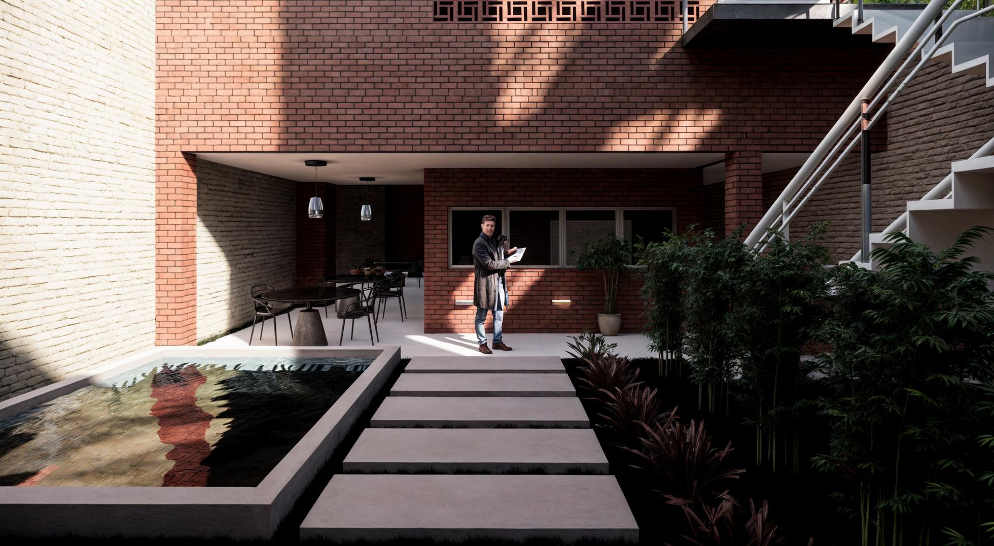 Todo el diseño igual se basó en incorporar el edificio existente dentro del predio, que en este caso fue utilizado como el lobby del hostal.