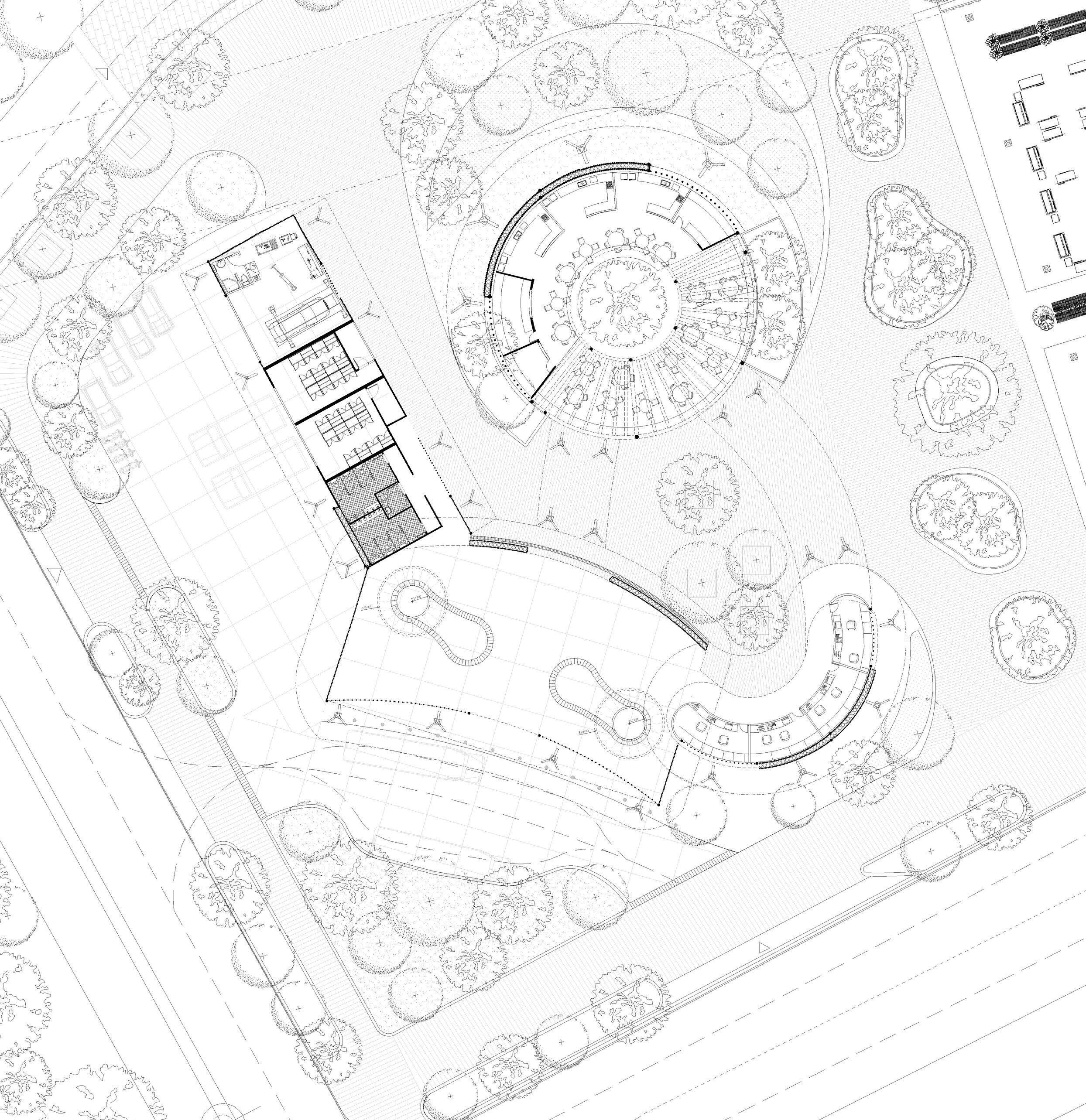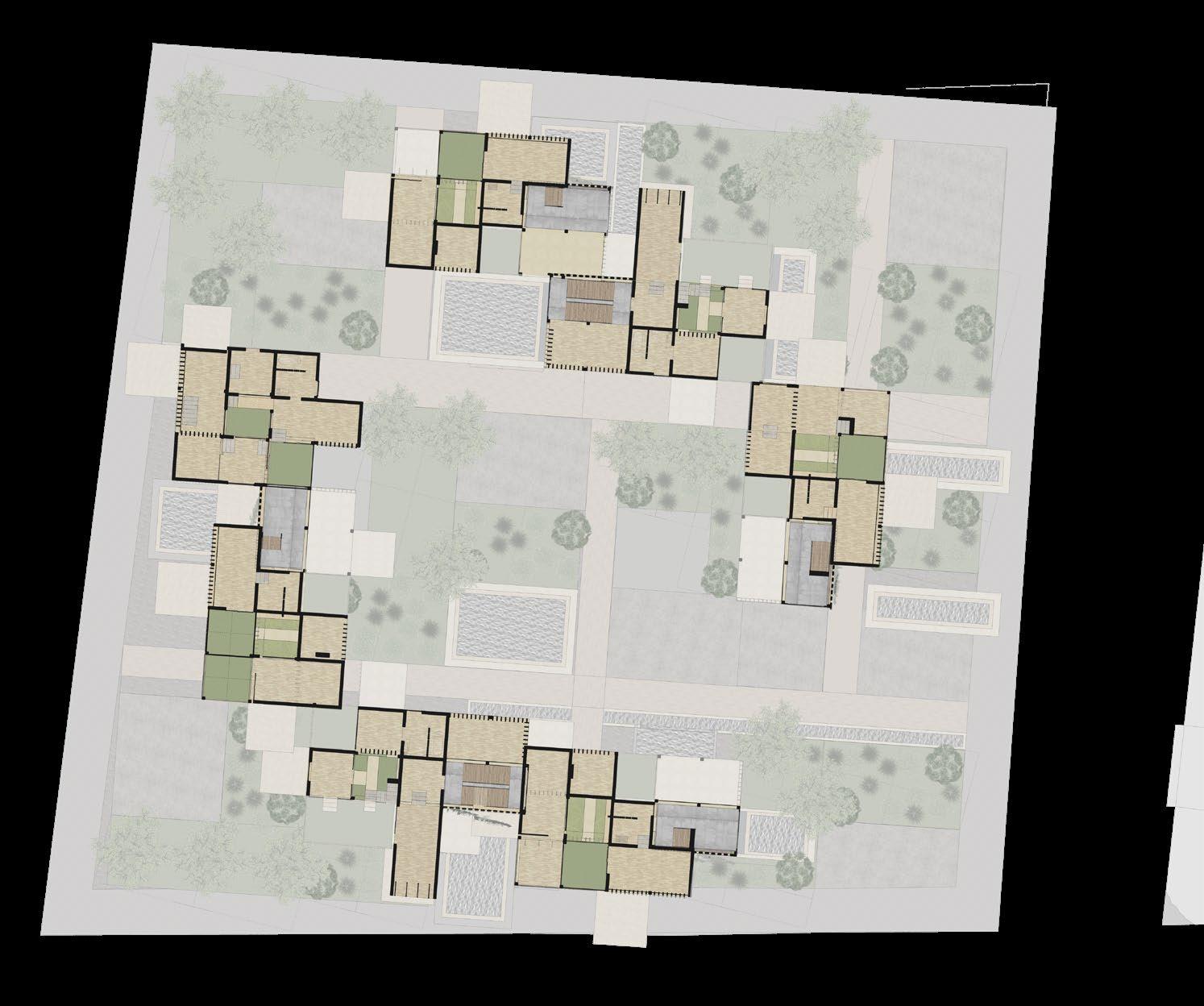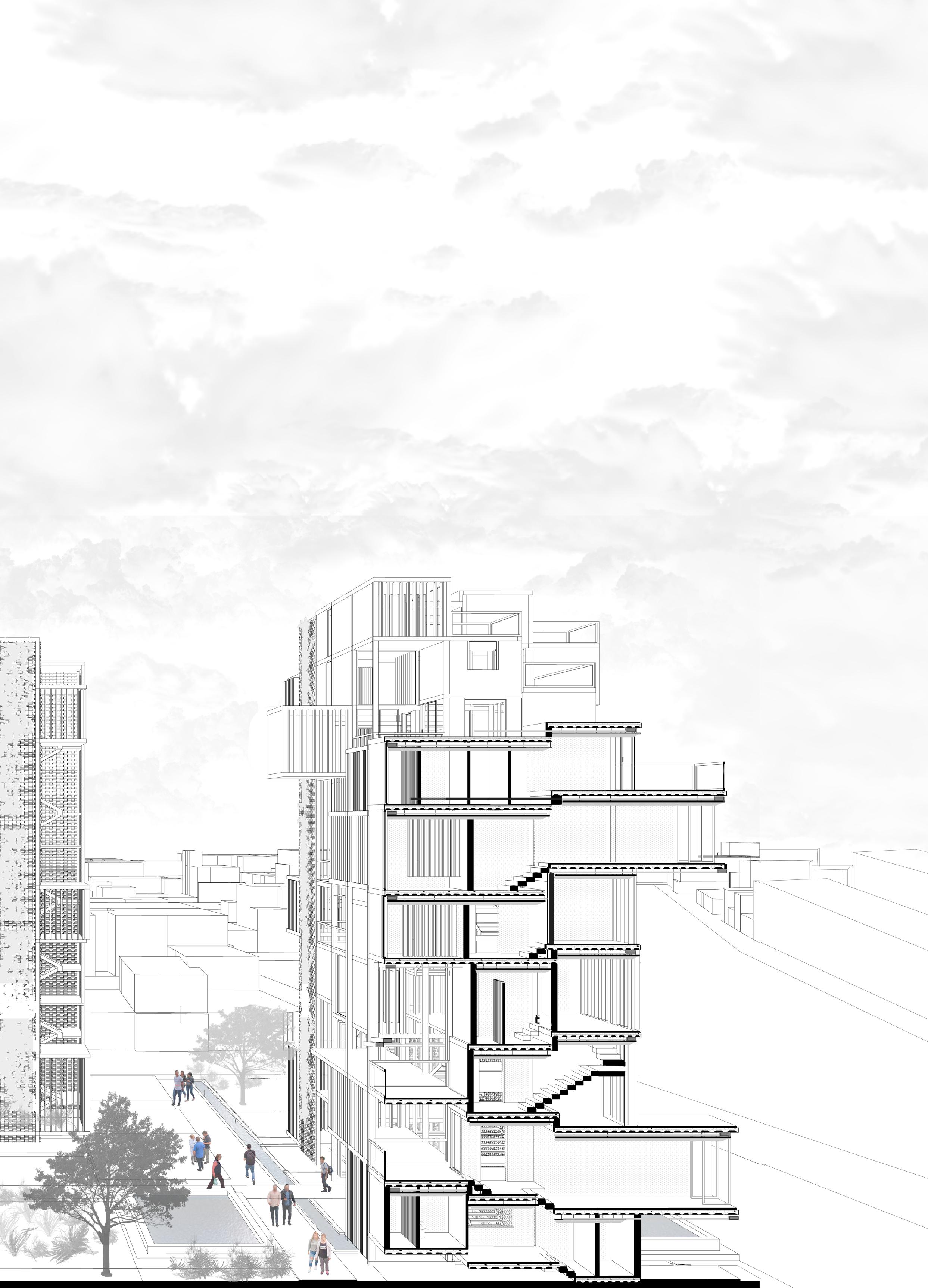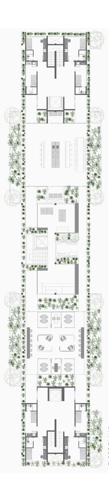 The ground level is planted by the green social public space, that create activies like comercial spots, outdoor cinema and green branches that enhance the social relationships and encrase the permanence in the proyect. However, the public space has the objective to conect the interior block with the city, and create a new form to experiment the urban blocks of Lisboa.