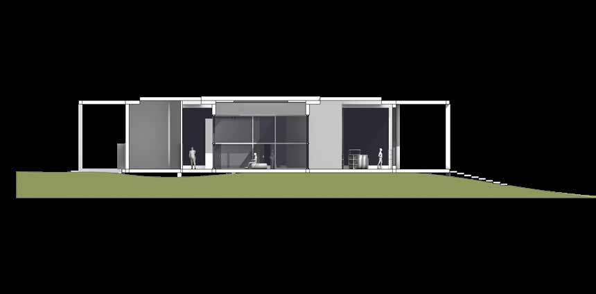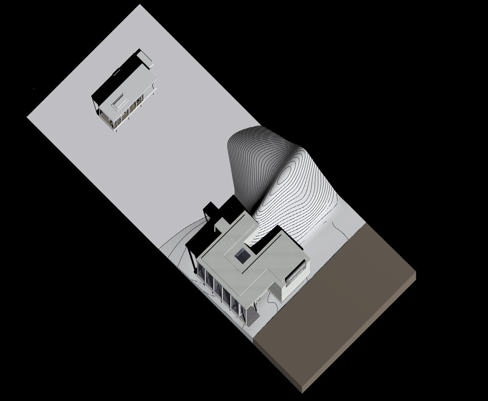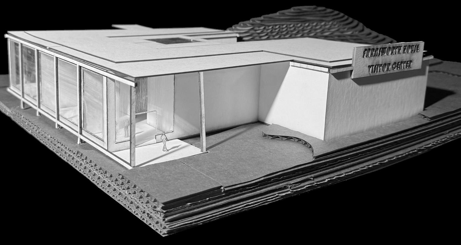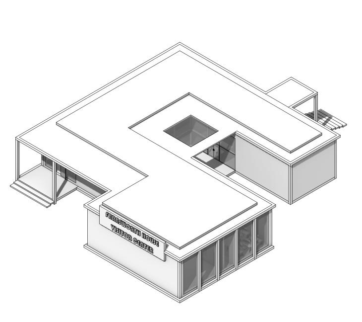THIS PROJECT BEGAN WITH CREATING A CUSTOM GRID TO ESTABLISH A SYSTEMATIC FOUNDATION FOR THE DESIGN OF A VISITOR CENTER, ALLOWING FOR THE DEVELOPMENT OF A COHESIVE MASSING. INSPIRED BY THE FARNSWORTH HOUSE, CRITICAL ELEMENTS FROM MIES VAN DER ROHE’S DESIGN PRINCIPLES WERE INTEGRATED, SHAPING A STRUCTURE THAT ENHANCES THE VISITOR’S EXPERIENCE OF MIES’ ARCHITECTURAL LEGACY. THE MASSING WAS THOUGHTFULLY DIVIDED TO DIFFERENTIATE SPACES, WITH DISTINCT AREAS DESIGNATED FOR WORKERS AND THE PRIMARY AUDIENCE—VISITORS— CREATING A HARMONIOUS BALANCE BETWEEN FUNCTION AND REVERENCE FOR THE ICONIC DESIGN.