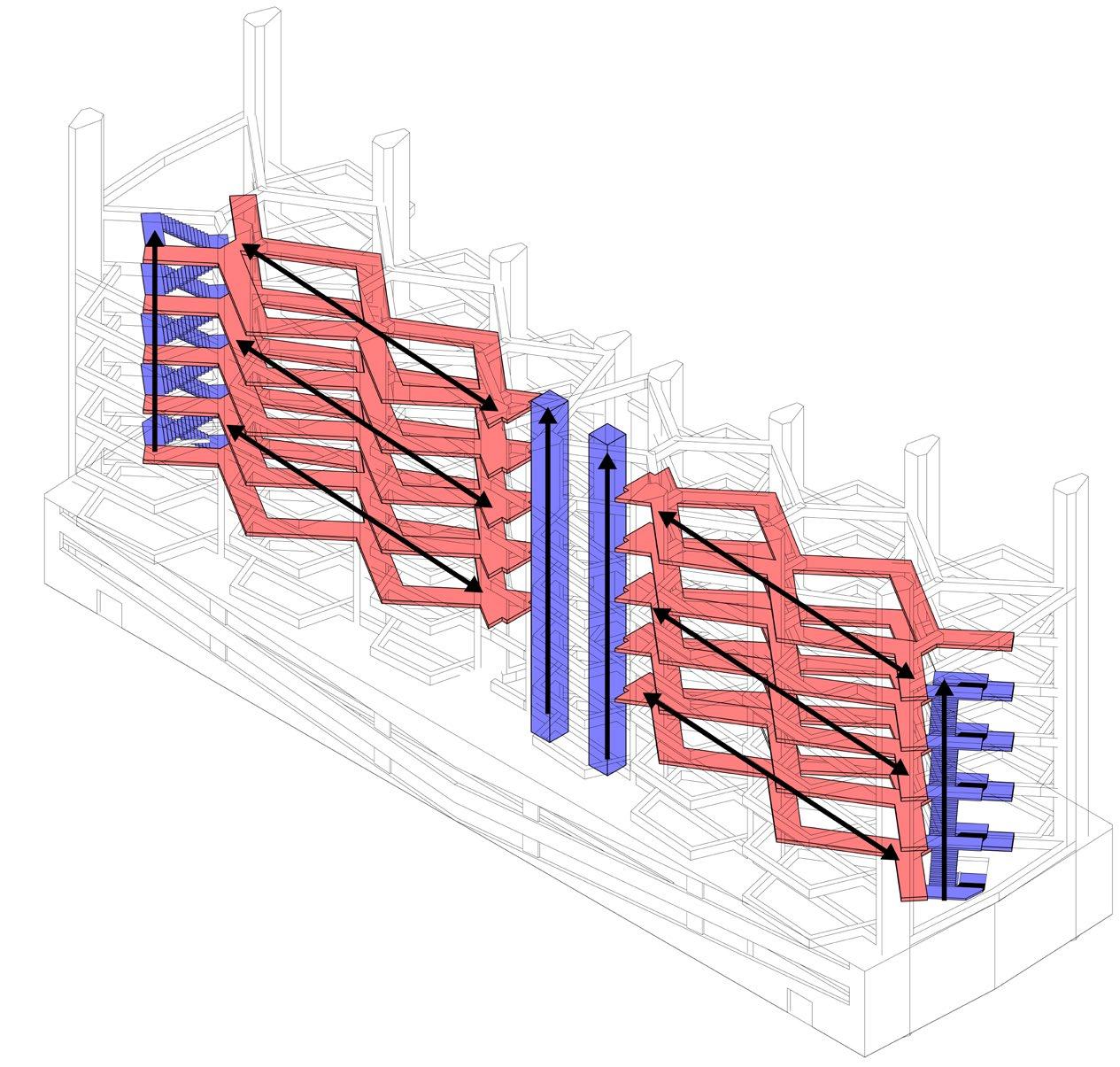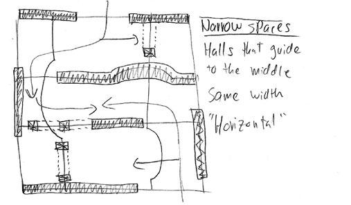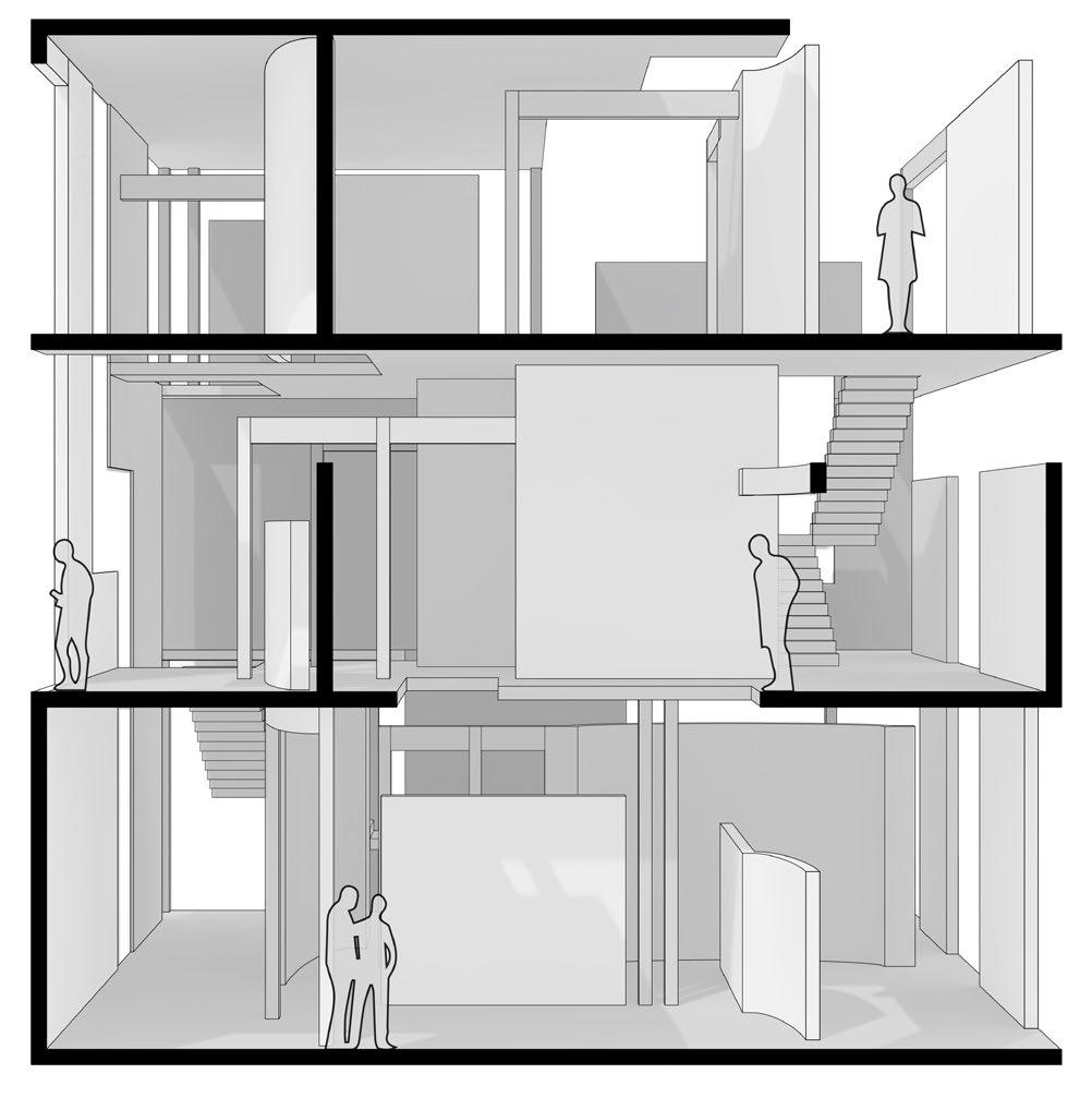 THE PROJECT BEGAN WITH A 9X9 GRID WITHIN A 36X36 SQUARE, INTRODUCING DELIBERATE ANOMALIES TO MODIFY THE GRID AND ESTABLISH THE BUILDING’S FOUNDATIONAL SYSTEM. FROM THIS SYSTEM, WALLS, COLUMNS, AND BEAMS WERE CONSTRUCTED TO SHAPE A SPATIAL COMPOSITION THAT GUIDES CIRCULATION INTENTIONALLY. STRUCTURAL ELEMENTS WERE EMPLOYED TO DIRECT MOVEMENT, WITH EACH FLOOR SHAPING THE JOURNEY IN DISTINCT WAYS: ONE FLOOR ENCOURAGES TRAVEL ALONG THE X-AXIS, ANOTHER ALONG THE Y-AXIS, AND THE FINAL LEVEL OPENS INTO A FREER, MORE EXPANSIVE LAYOUT.