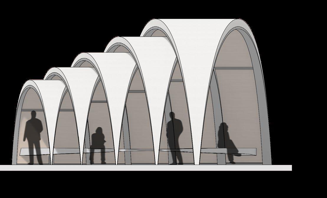 THIS PROJECT AIMED TO EMBODY THE PRINCIPLES OF FUTURISM, CHANNELING CONCEPTS OF MOTION AND SPEED THROUGH DESIGN. IT BEGAN WITH A SINGLE TRIANGLE SHAPE CHOSEN FOR ITS SHARP CORNERS AND STRETCHABLE FORM, QUALITIES THAT RESONATE WITH THE ESSENCE OF SPEED. A DYNAMIC SENSE OF MOVEMENT EMERGED BY REPEATEDLY SKETCHING AND STACKING THESE TRIANGLES, EACH SLIGHTLY BENT AND LAYERED. THIS APPROACH LAID THE FOUNDATION FOR A BUS STOP DESIGN THAT CAPTURES THE ENERGY AND FORWARD MOTION CENTRAL TO FUTURIST IDEALS.