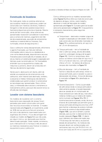 Construção de lavadores De modo geral, todos os sistemas alternativos aos lavadores mecânicos tradicionais, podem ser construídos com materiais (alvenaria, madeira e ferragem) e mão de obra (pedreiro/carpinteiro) facilmente disponíveis próximos à fazenda. Mesmo sendo de fácil construção, várias alternativas apresentadas necessitam considerável investimento para a compra de materiais, pagamento de mão de obra especializada, aquisição de componentes metálicos e material elétrico (motores, fios, iluminação, chaves de segurança etc.). Caso o cafeicultor esteja descapitalizado, dificilmente o agente financiador, por falta de melhores informações sobre o assunto ou obedecendo a uma norma desatualizada, disponibilizaria recursos financeiros para a construção de um secador, de um silo ou mesmo um sistema de lavagem e separação com técnicas usuais na construção civil. Os financiadores entendem que os equipamentos citados são máquinas e, portanto, devem ser produzidos em fábricas devidamente registradas. Sendo assim, deste ponto em diante, além de atender as expectativas do extensionista e do cafeicultor, este material será destinado, também, a pequenas e médias metalúrgicas devidamente credenciadas que querem produzir e comercializar as tecnologias aqui apresentadas. Para o último caso, o interessado deve solicitar o treinamento e licenciamento prévio, para que não ocorram erros na difusão das tecnologias.
