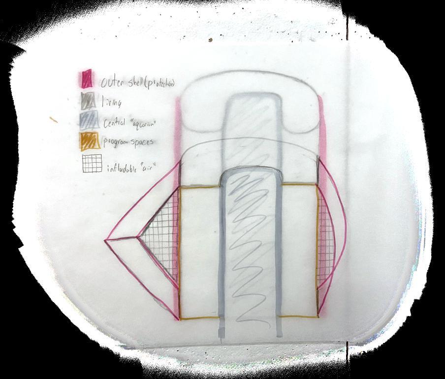 Noticing it will be difficult to constrcut we decided to take another route but maintain the idea of getting something close to the spherical shape since it was important we beat the pressure. We also started thinking about how we would use air to help with our movement throught the ocean. We decided to have a space fill up with air to give us buoyancy to achieve vertical movement. Further development of this idea, gave our architecture. We developed this exterior shell for our architecure to ensure that would change state to allow