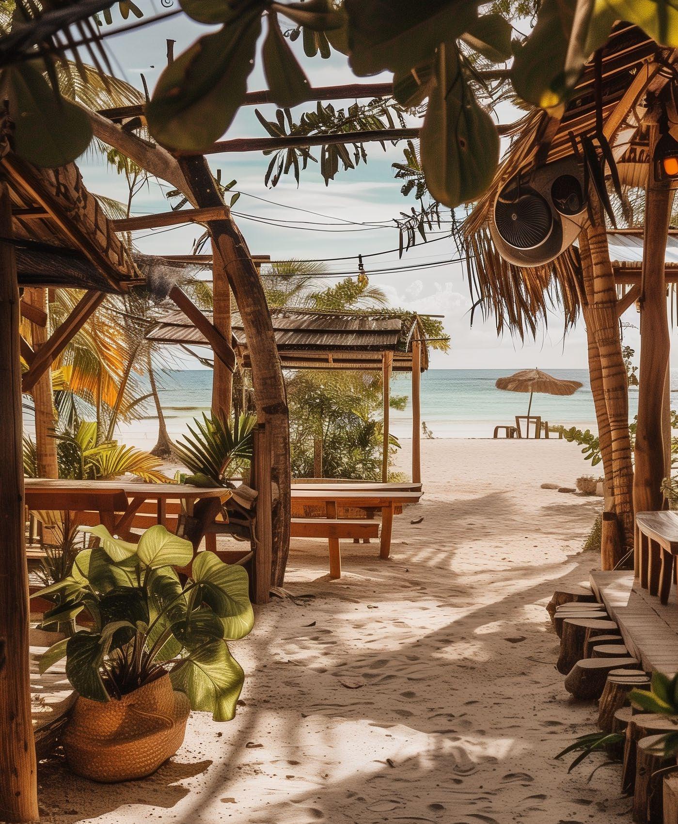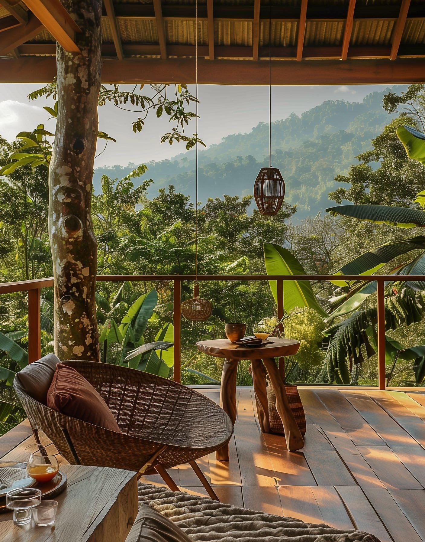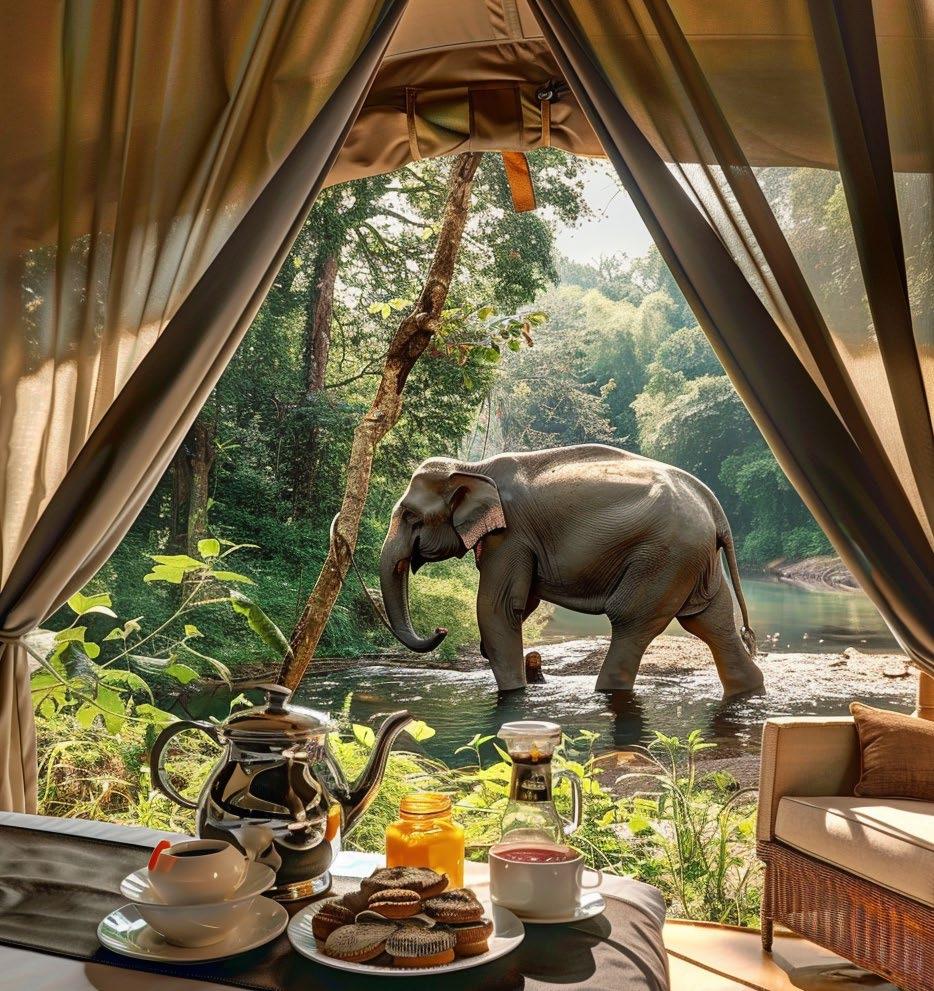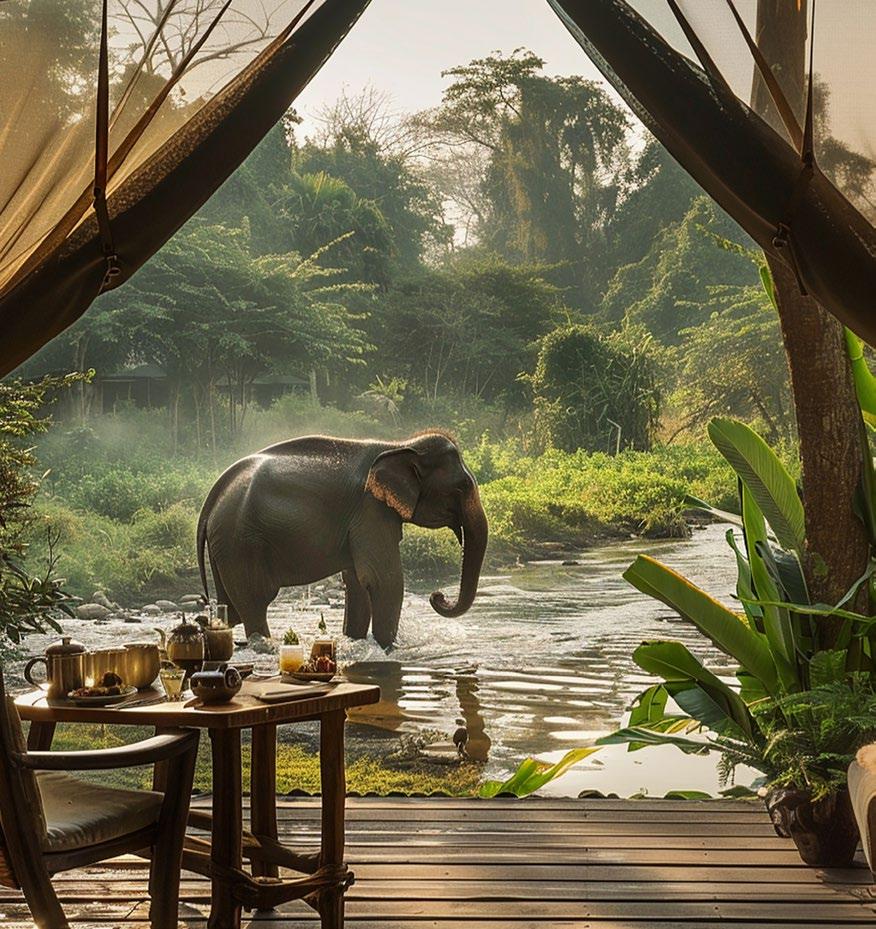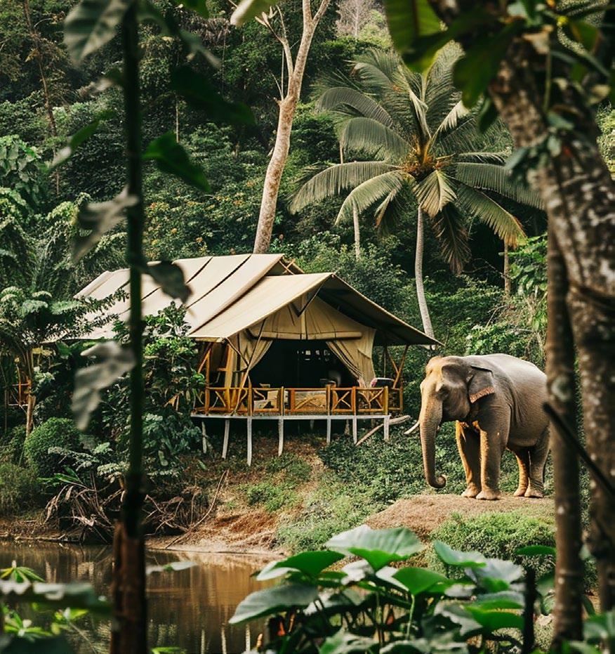 Final images result from an iterative process of feeding and adjusting prompts alongside input images to achieve specific results, in this case the experience of waking up to elephants bathing in a creek.
