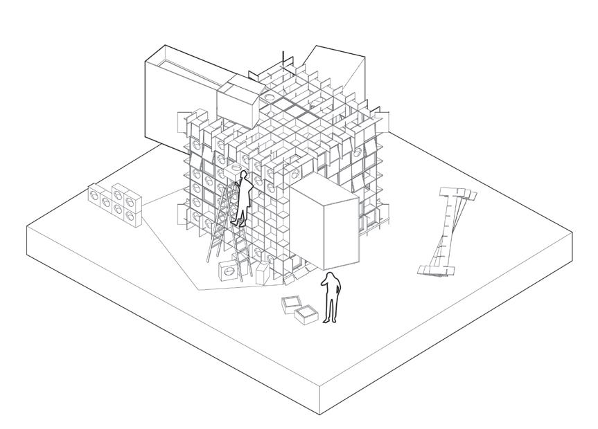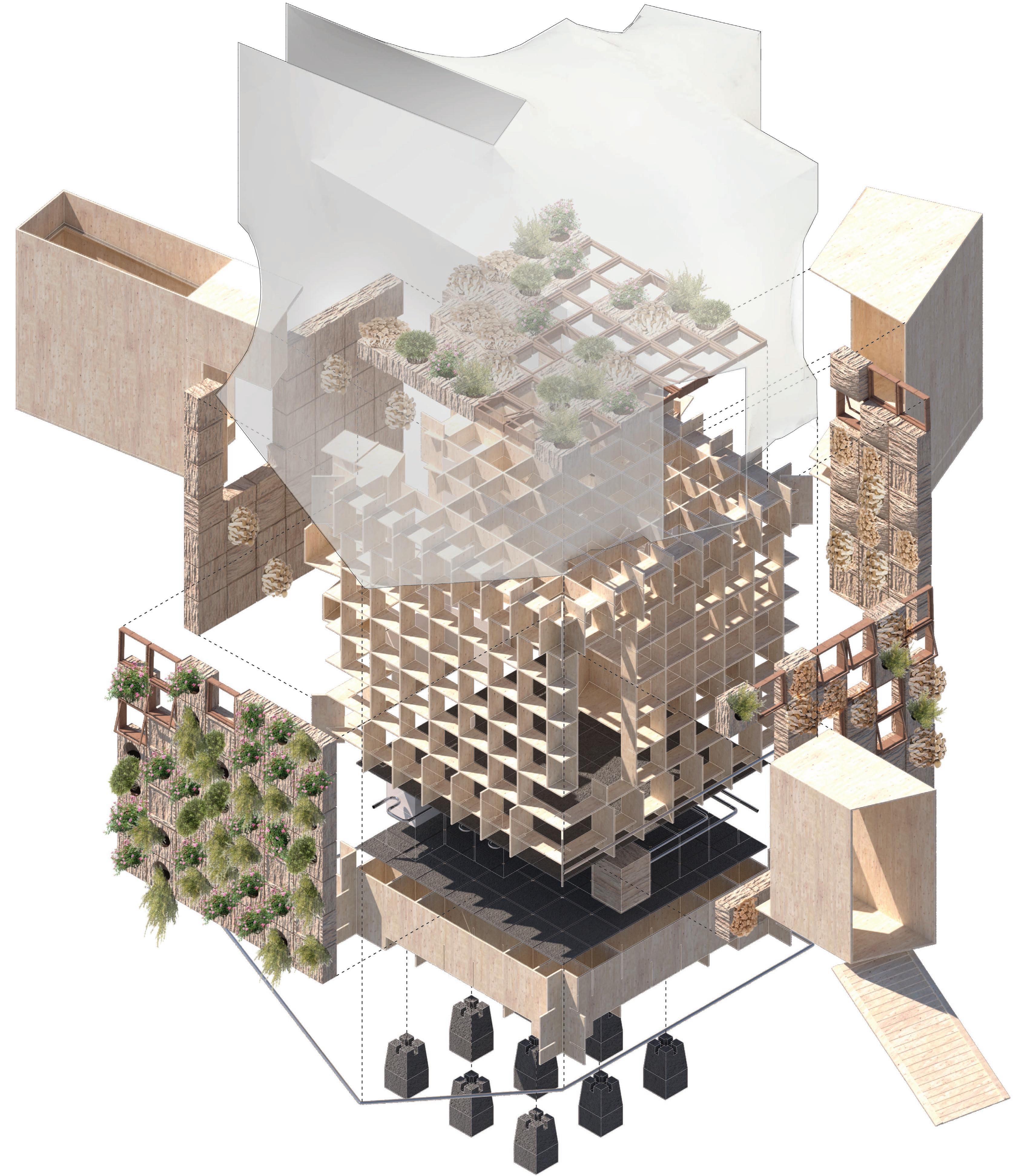 The microhome’s construction is composed of a CNC-milled construction plywood frame filled in with insulative mycelium blocks and enclosed by plastic shrinkwrap that creates a greenhouse environment. Outside of the frame, the mycelium blocks double as vegetable planters that can be maintained and interchanged based on solar orientation and agricultural season. Assembled in a sliding, eggcrate manner, the plywood waffle structure can be built efficiently and economically