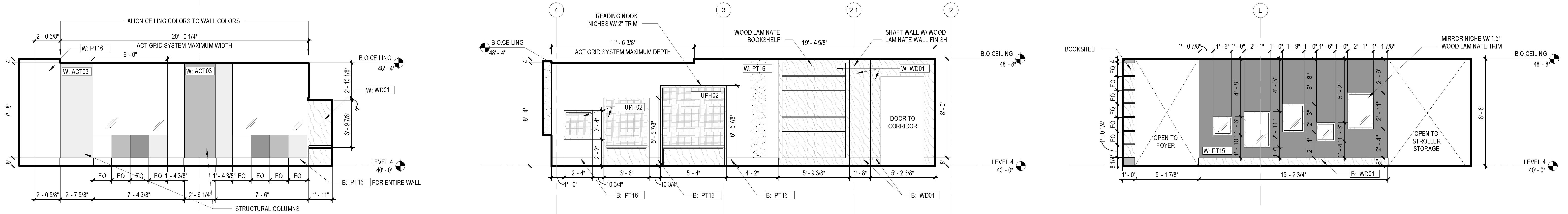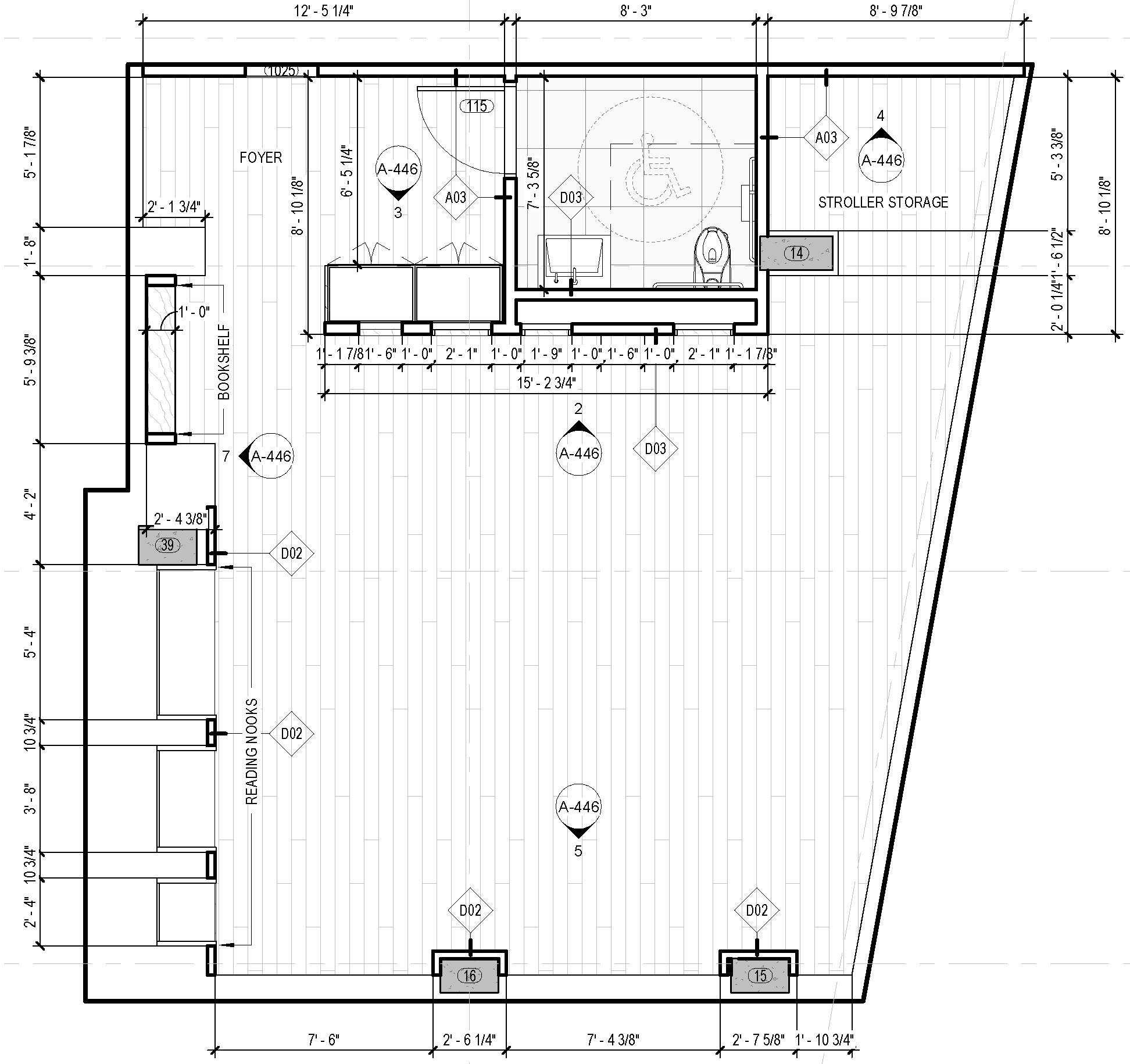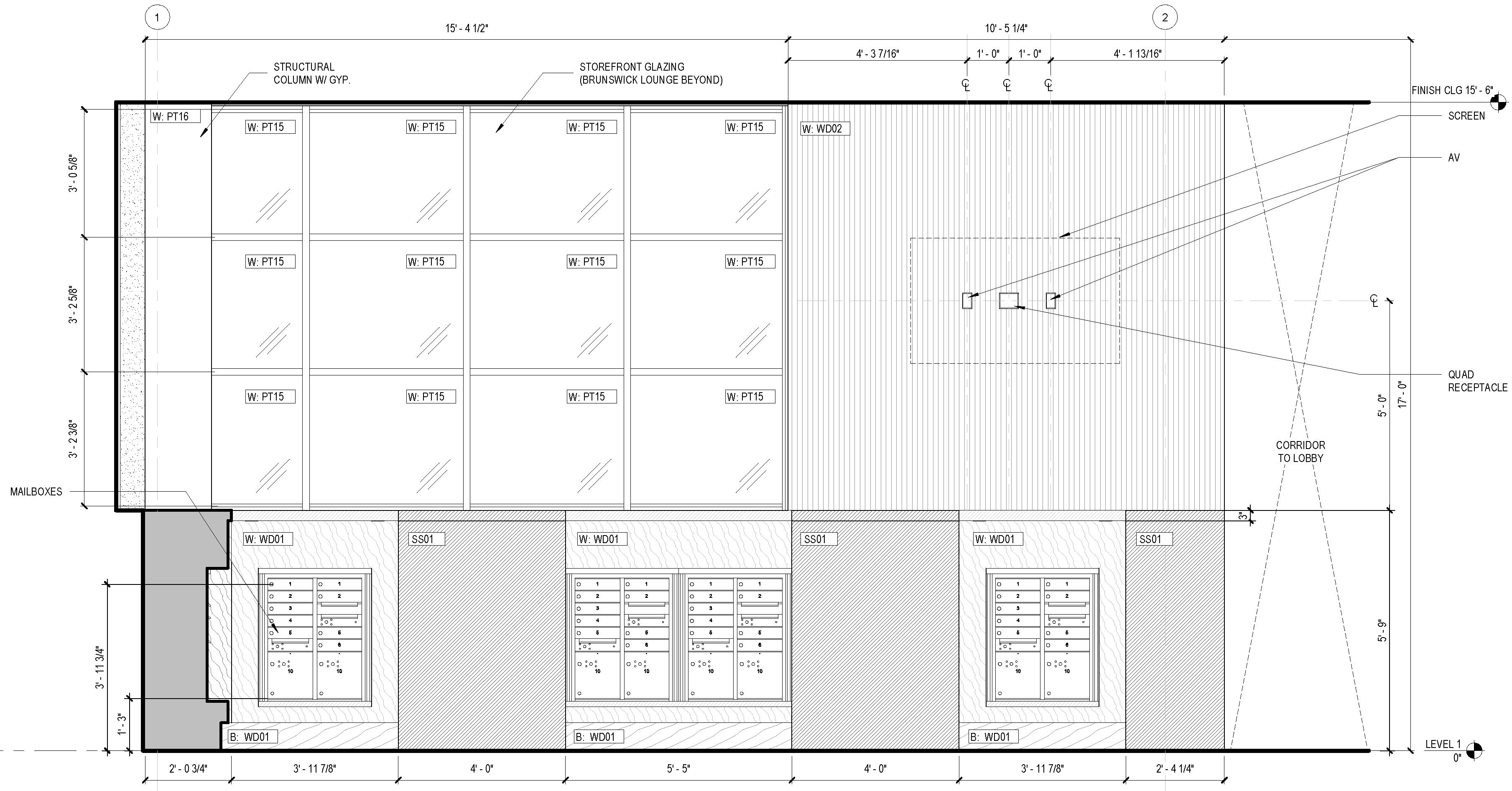 Progressing into construction documentation, translation of design into Revit involved production of enlarged floor plans, interior elevations, and a material key schedule. Included here is my documentation of the lobby, ground floor lounge, mail room, and children’s playroom.