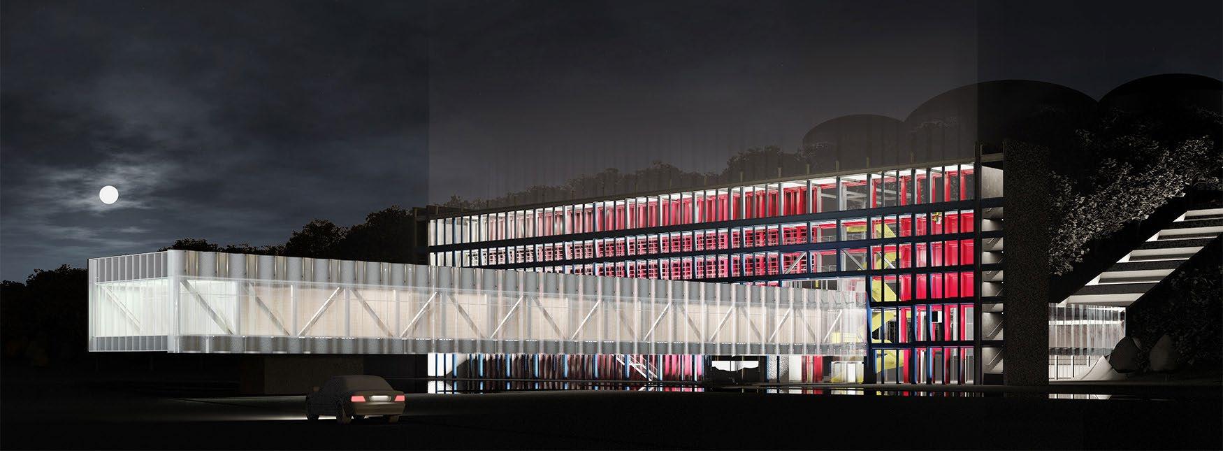 The project is divided into two volumes, a Bar and a Wall. Using a box truss to span from hill to road, the Bar is a manifestation of the ceramic-making process from earth to world Facing the primary road, the Wall becomes a statement for ceramics, dedicated to the display of both individual art pieces and the facade of the Wall itself.