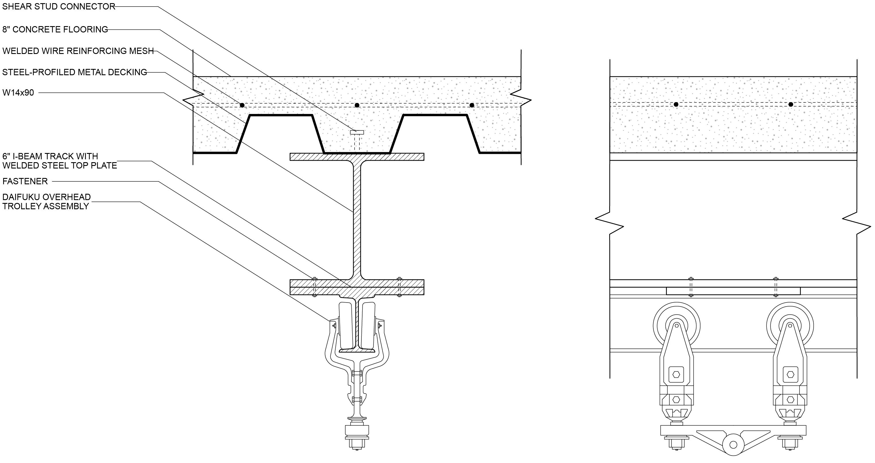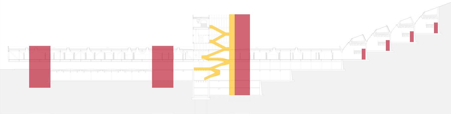 Attached to existing structure, the overhead conveyor belt forms the genesis of the project.