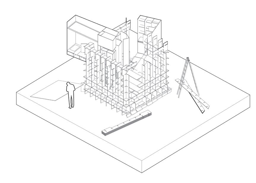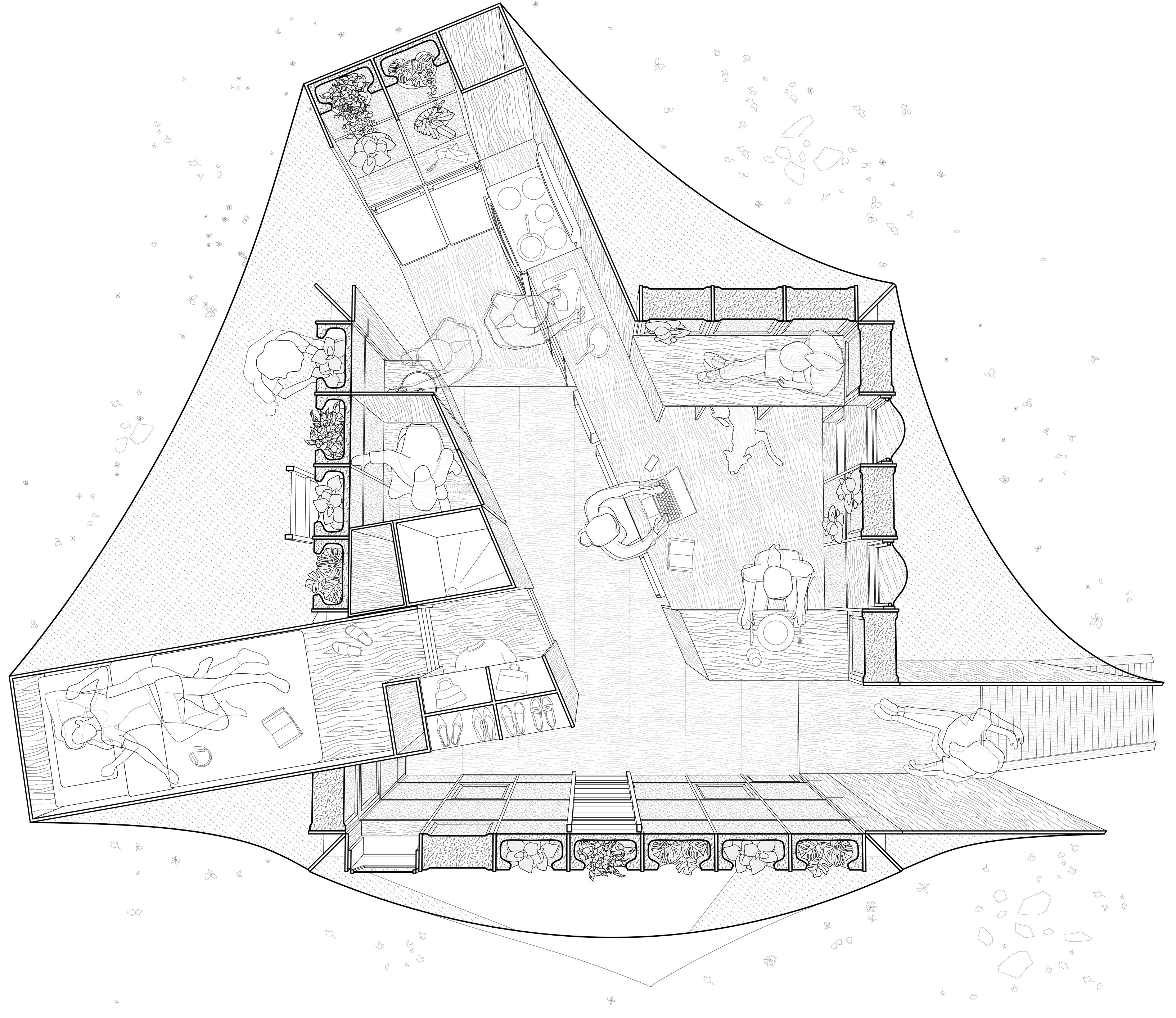 The plan perspective illustrates the single resident’s movements and tasks conducted throughout the day, showing how a small structure can accommodate a large variety of programmatic needs.