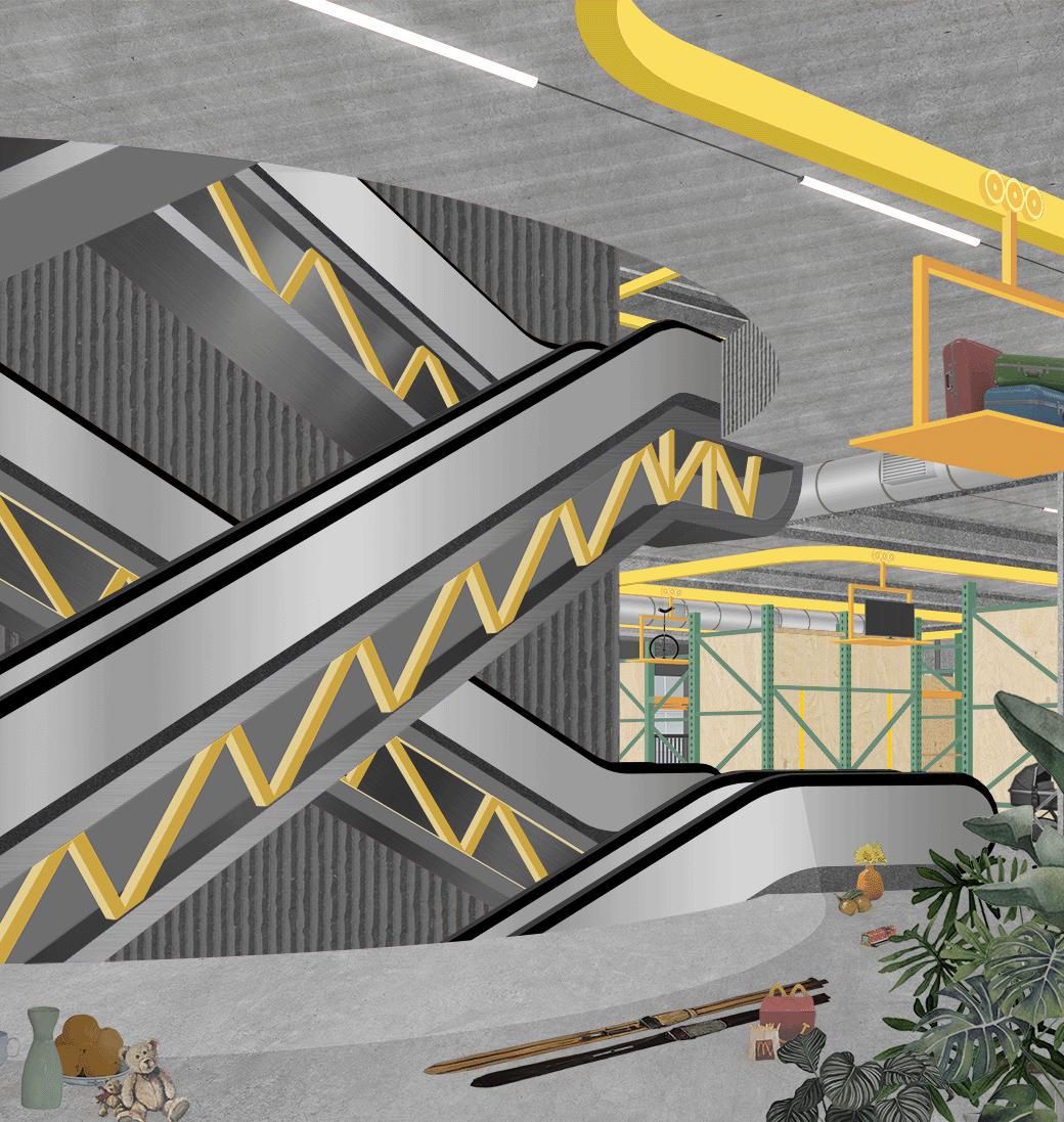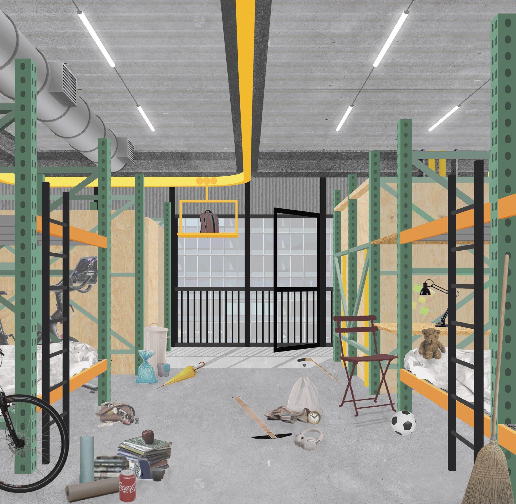 Spaces in between shelves are served by an overhead conveyor belt that snakes along the existing structure, delivering objects to directly to living shelves. As such, these spaces become fields of objects that present opportunities for neighborly interaction, as the acquisition of material goods incentivize tenants to leave their isolated shelves.