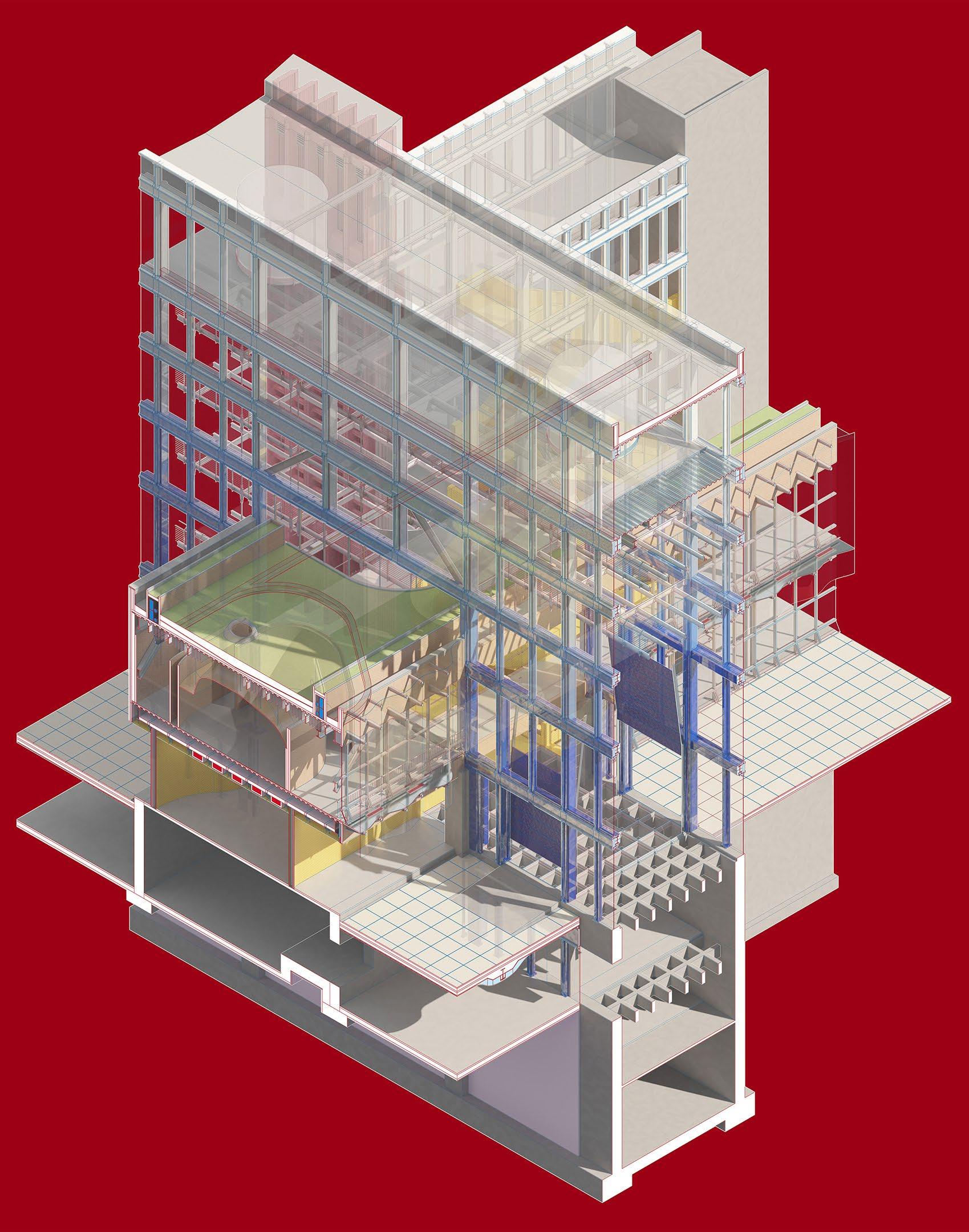 The school’s existing construction is characterized by a terra cotta segmented floor arch system supported by steel and concrete, as depicted in this cutaway worm’s eye axonometric drawing.