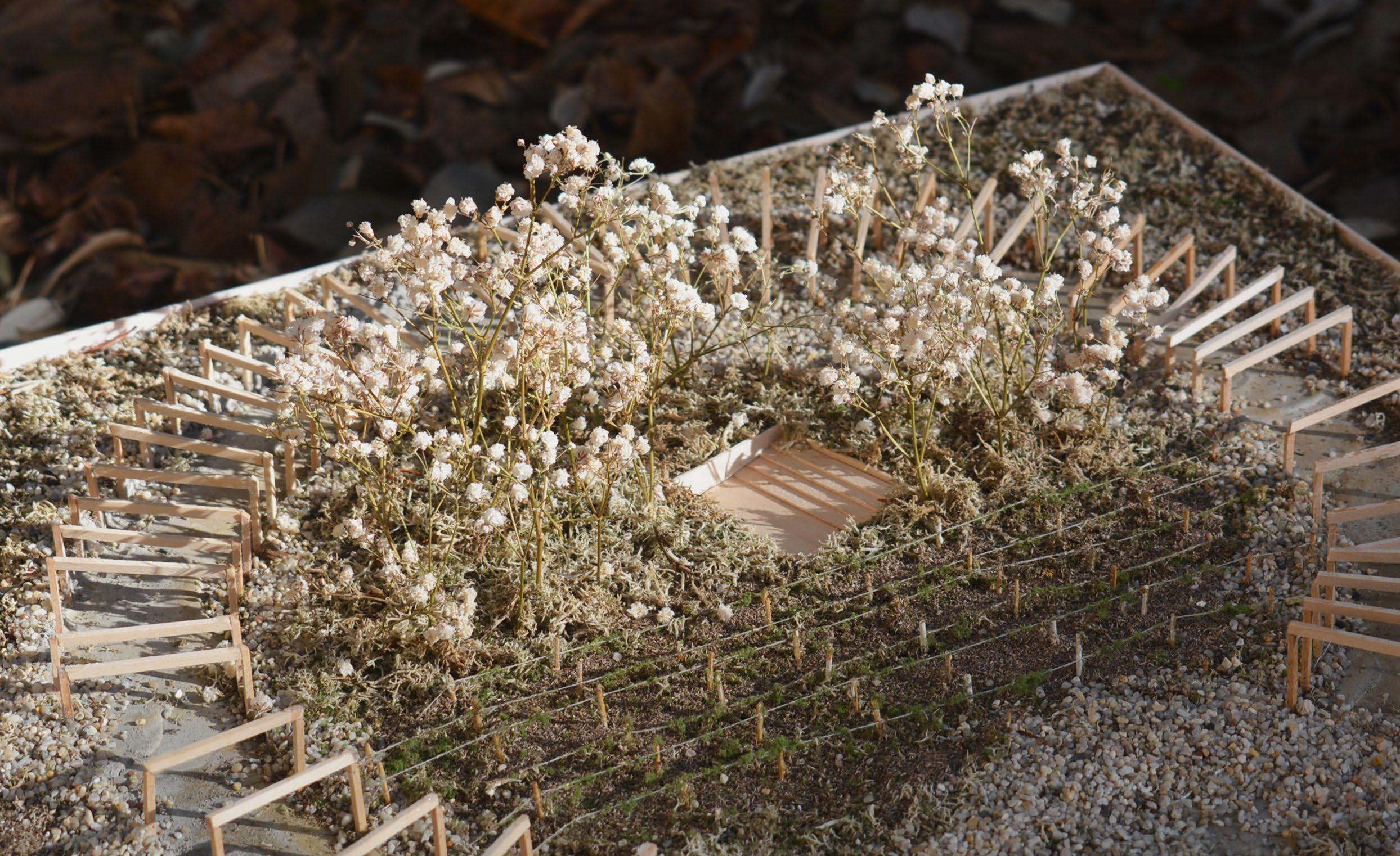 Photographed in an outdoor garden, this 1:200 model involves a two-step casted base with plaster and concrete that carries a timber structure, vineyard, and amphitheater set among informal vegetation.
