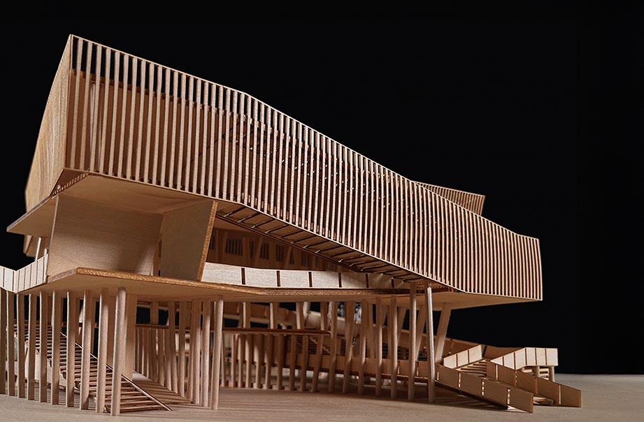 (Right) Rising out of a CNC-milled MDF base, this basswood model displays both machine-cut and hand-cut pieces that compose a stilted and louvered civic center.