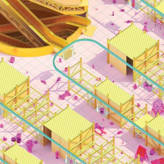 Reflecting the endless expanses of distribution warehouse interiors, this rendered axonometric speculates upon an infinite landscape infiltrated by the machines of material movement and consumption.