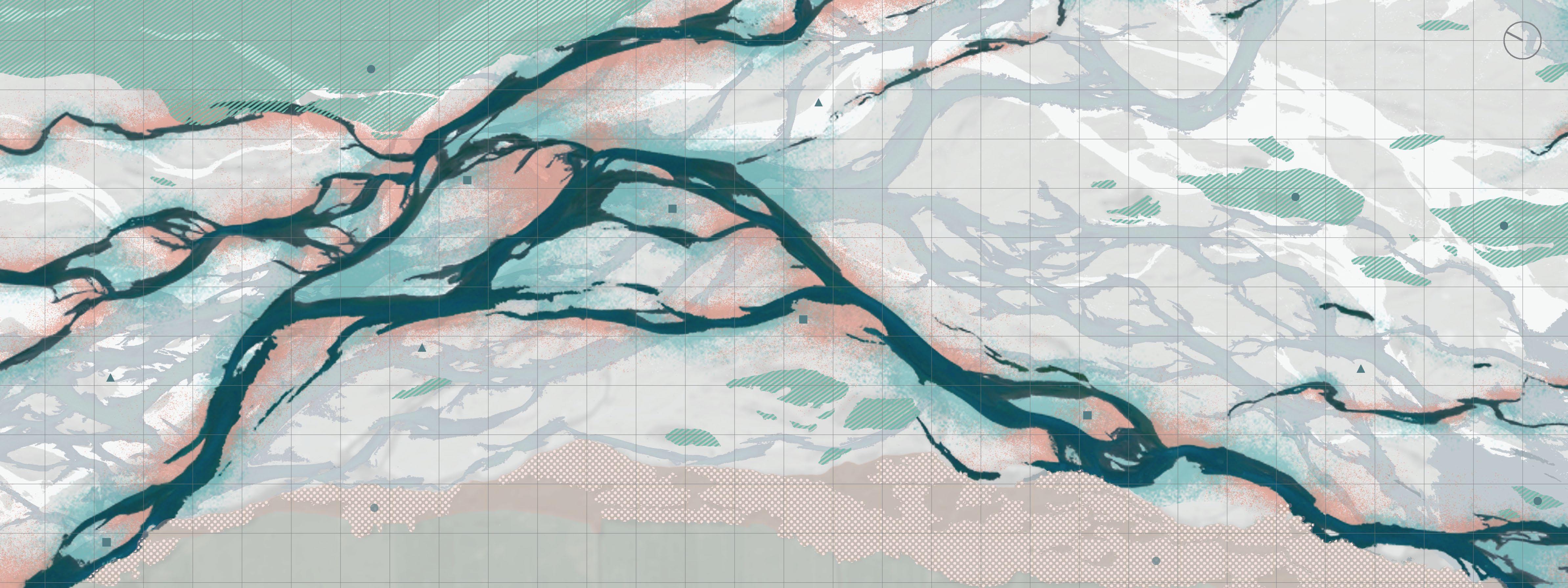 A combination of GIS/Illustrator vector work with Photoshop brushes and collaging, this series of maps reveals local conditions to the site of Sarasota, as well as the physical forces that shape the dynamic form of New Zealand’s Rakaia River.
