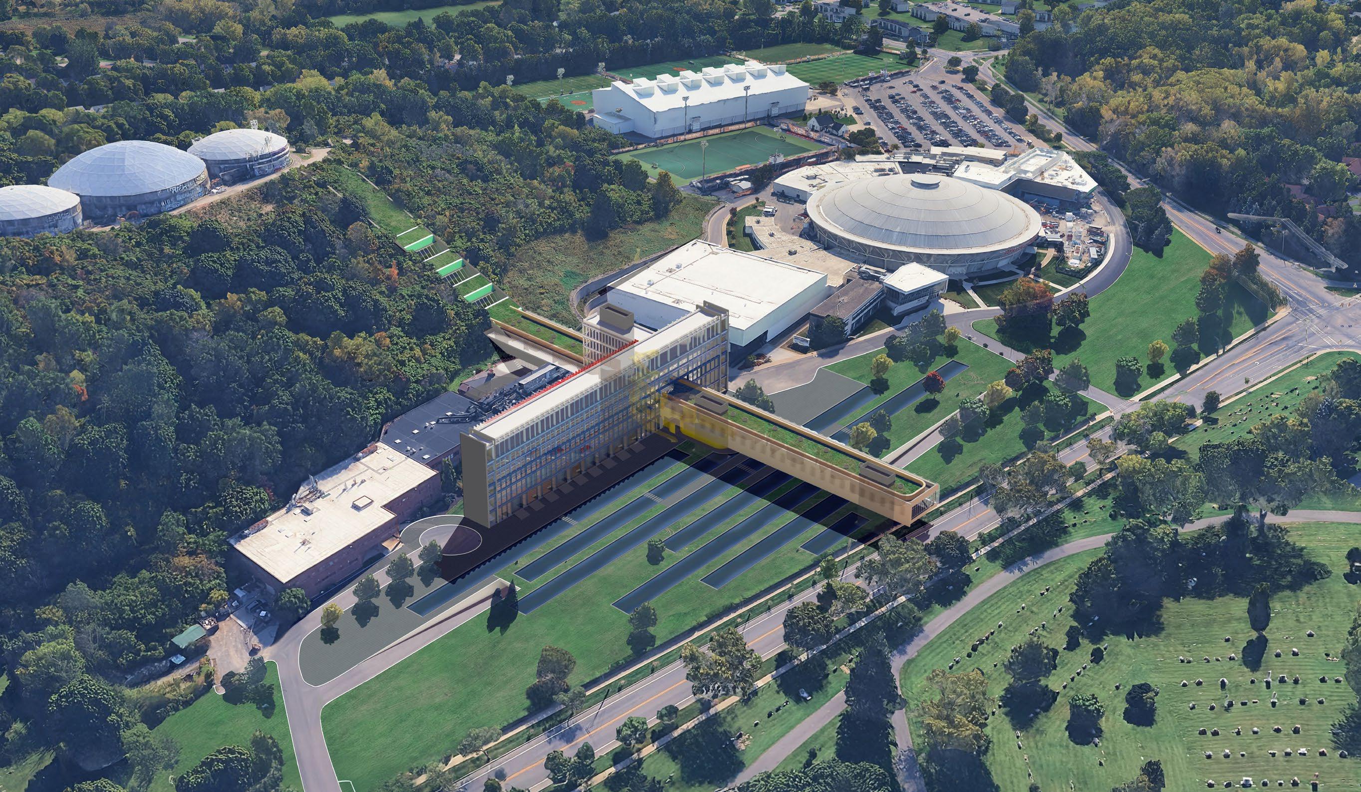 LEFT The expansion announces itself as an extension of the greater Lally Athletics Complex, as the Wall obeys the radial logic from the dome’s center. Reflecting pools in front serve both as a public plaza feature and water retention strategy.