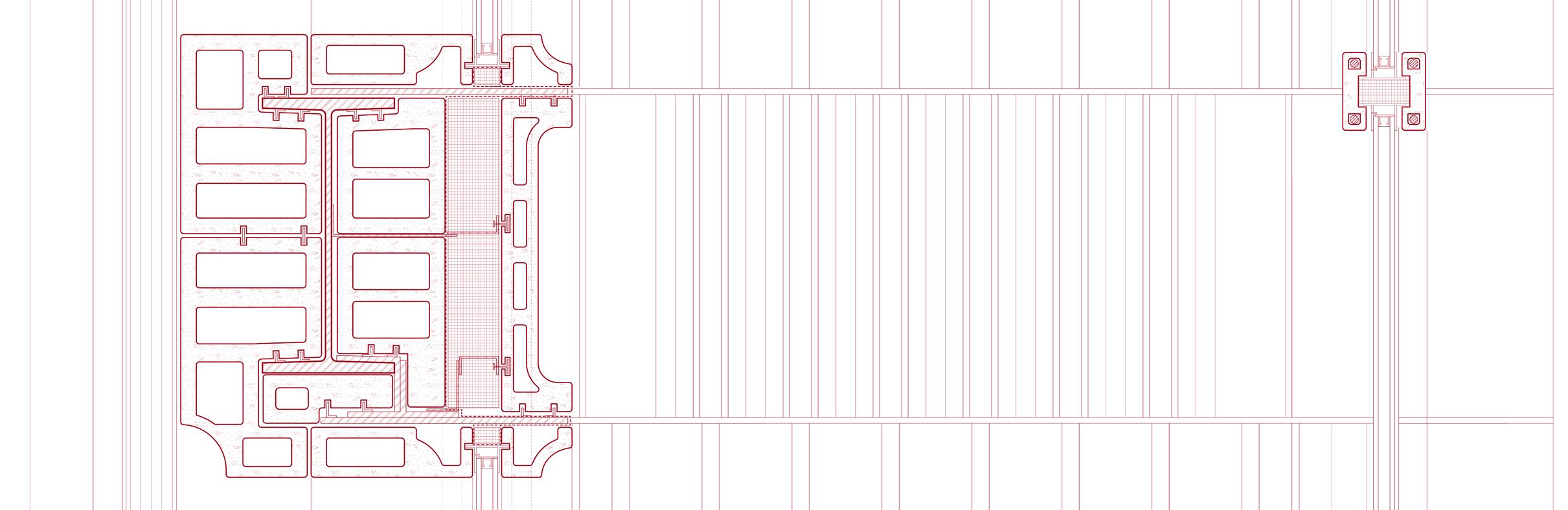 The new facade assembly integrates functions of thermal, structural, and fireproofing performance, in addition to gallery display. Each mullion doubles as a mechanical chase for ductwork. Tension rods and insulation between each ceramic member ensure structural integrity and thermal continuity at the building’s envelope.