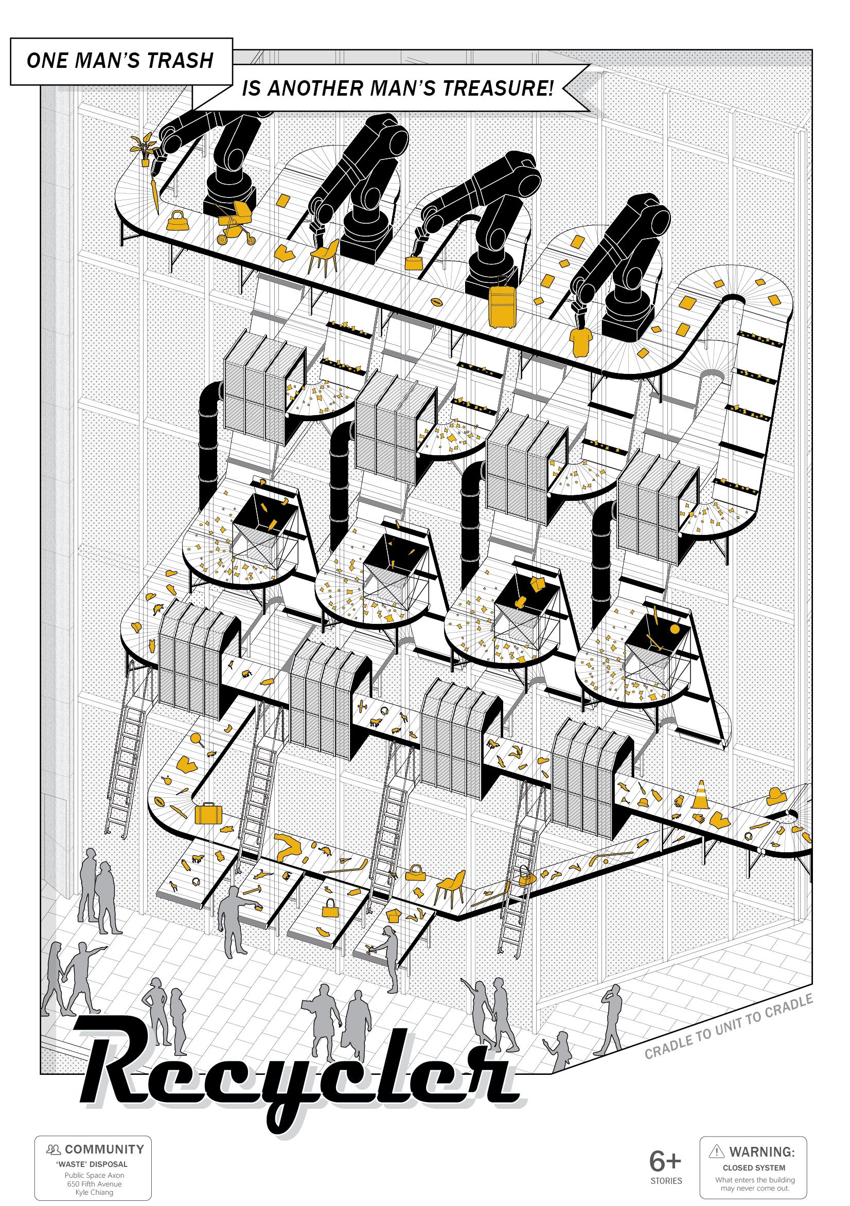 Objects deteriorate as they reach the base of the tower, where scrap material can be reproduced into new goods that are sent back to the top. Pedestrians can also drop off unwanted items at this location, feeding material into a massive, looping system.