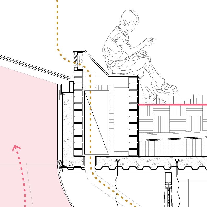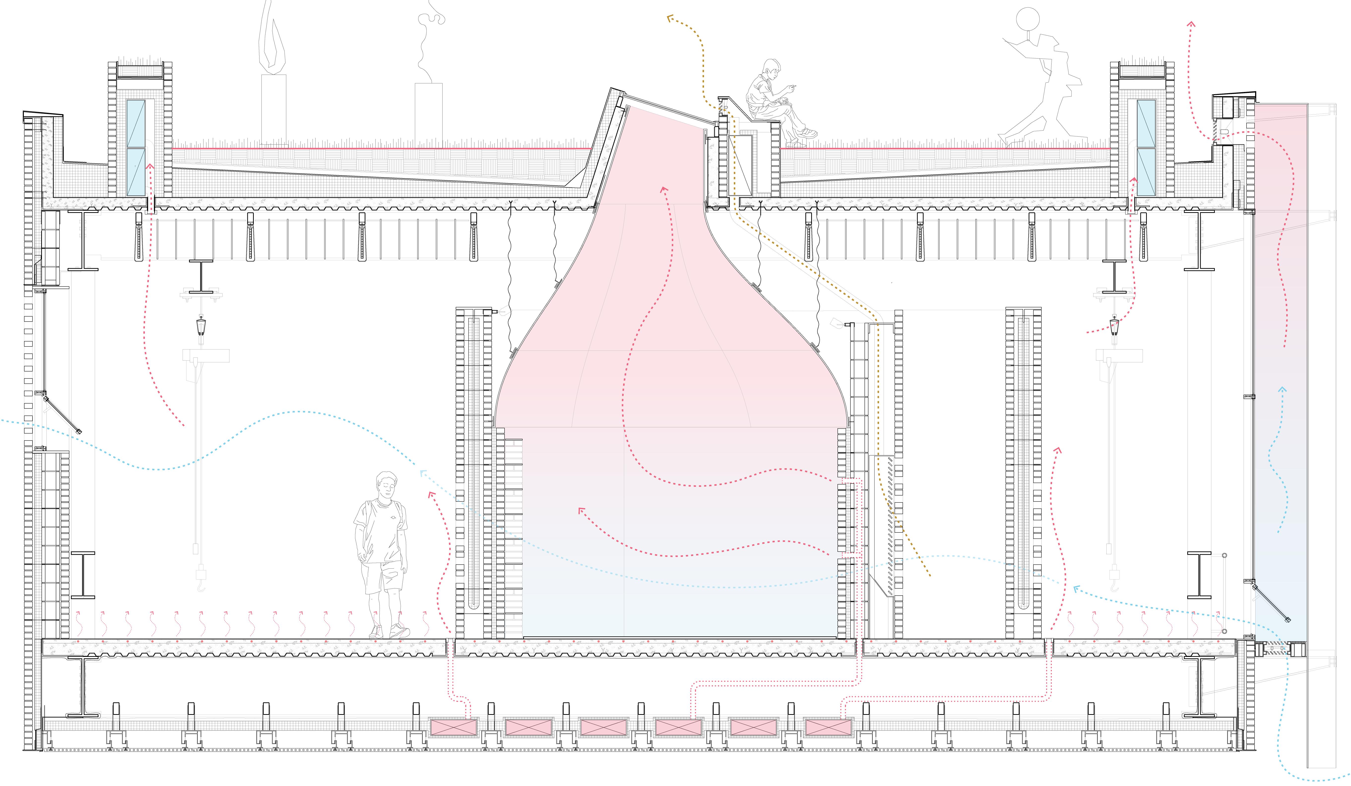 Reaching temperatures of up to 3270°F, heat from the kilns is redirected through the cavity of the Wall’s double-skin facade to induce stack ventilation in the summer and insulation in the winter. Heat is directed through copper pipes clad with terra cotta pieces, utilizing the thermal resistance capacities of both materials.