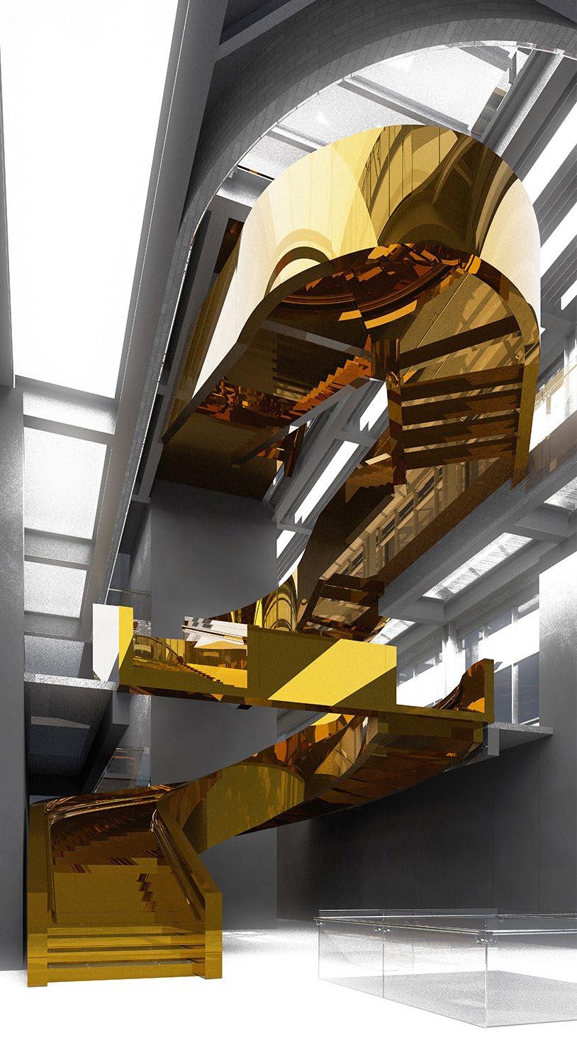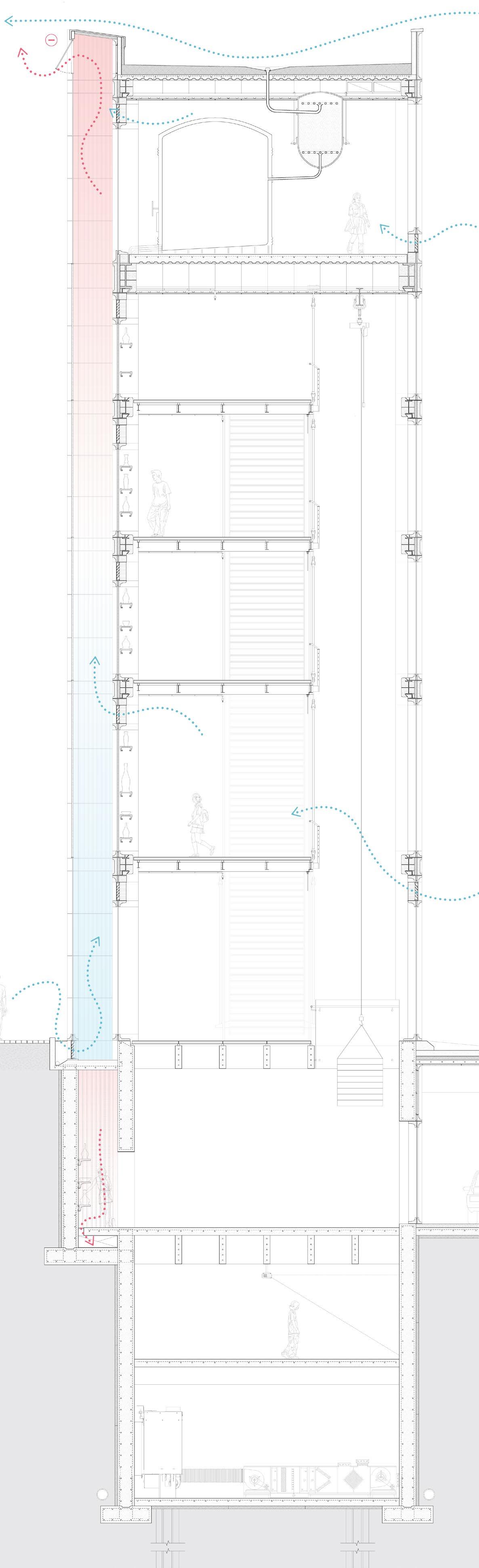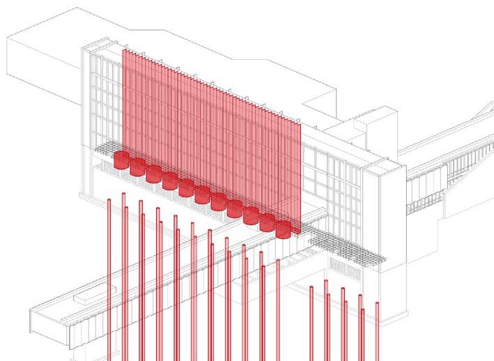 Repositioning the tower involves reconstruction of the enclosure, featuring curtain walls that display its inner machinery to the urban surroundings.