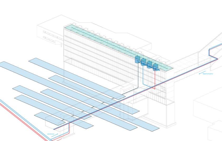 In addition to a section displaying typical root depths of common plants, the site map depicts surrounding community gardens, the site’s current high energy consumption in relation to surrounding buildings, as well as the potential for solar energy given the school’s southern orientation. This analysis informed both the design of garden pods in terms of soil depth and sizing, as well as the decision to incorporate rooftop photovoltaic panels.