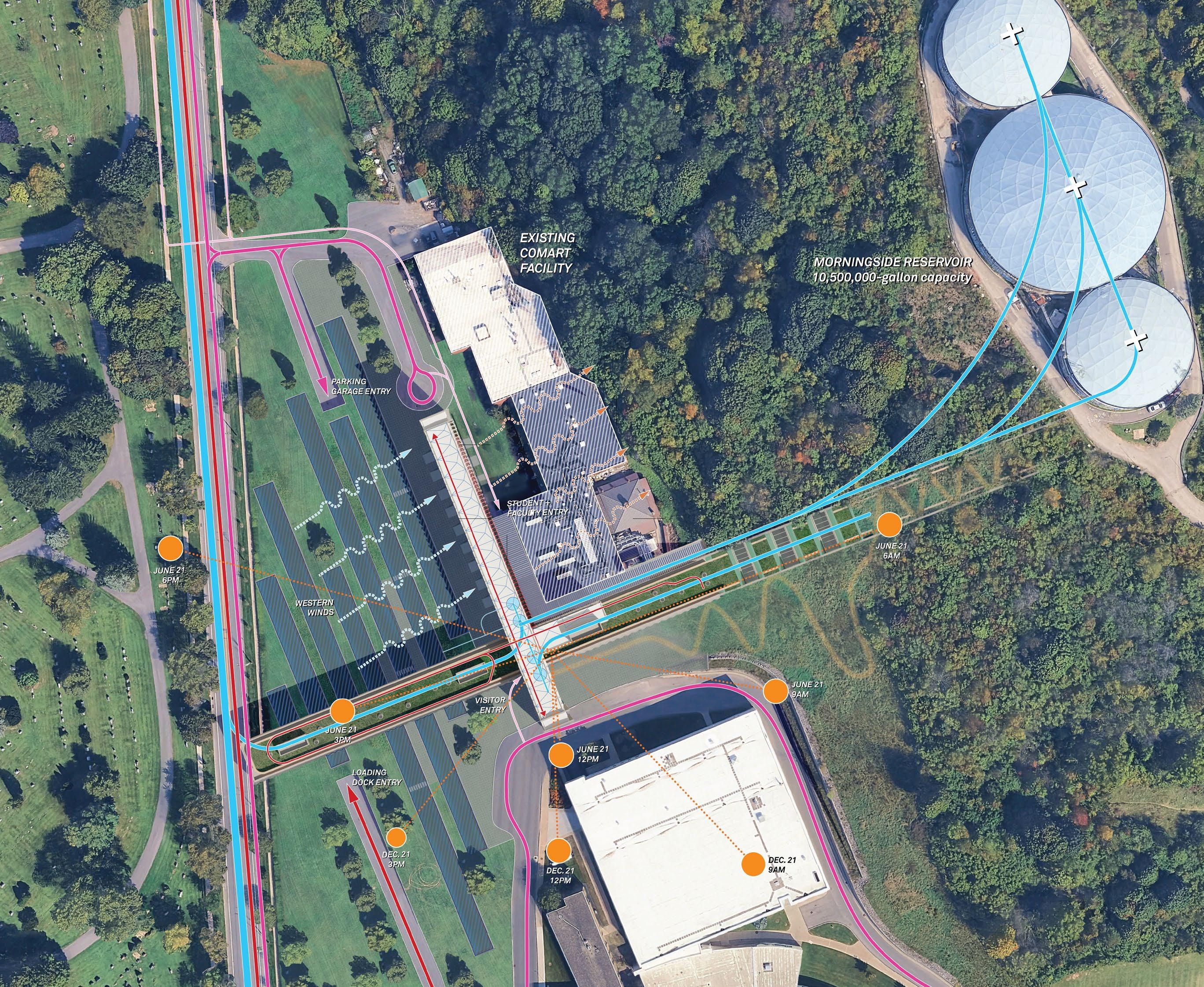 Materials, people, light, and resources as they flow through the site are diagrammed. Hosting the water-intensive program of claymaking, the project takes advantage of the existing reservoir atop its adjacent hill.