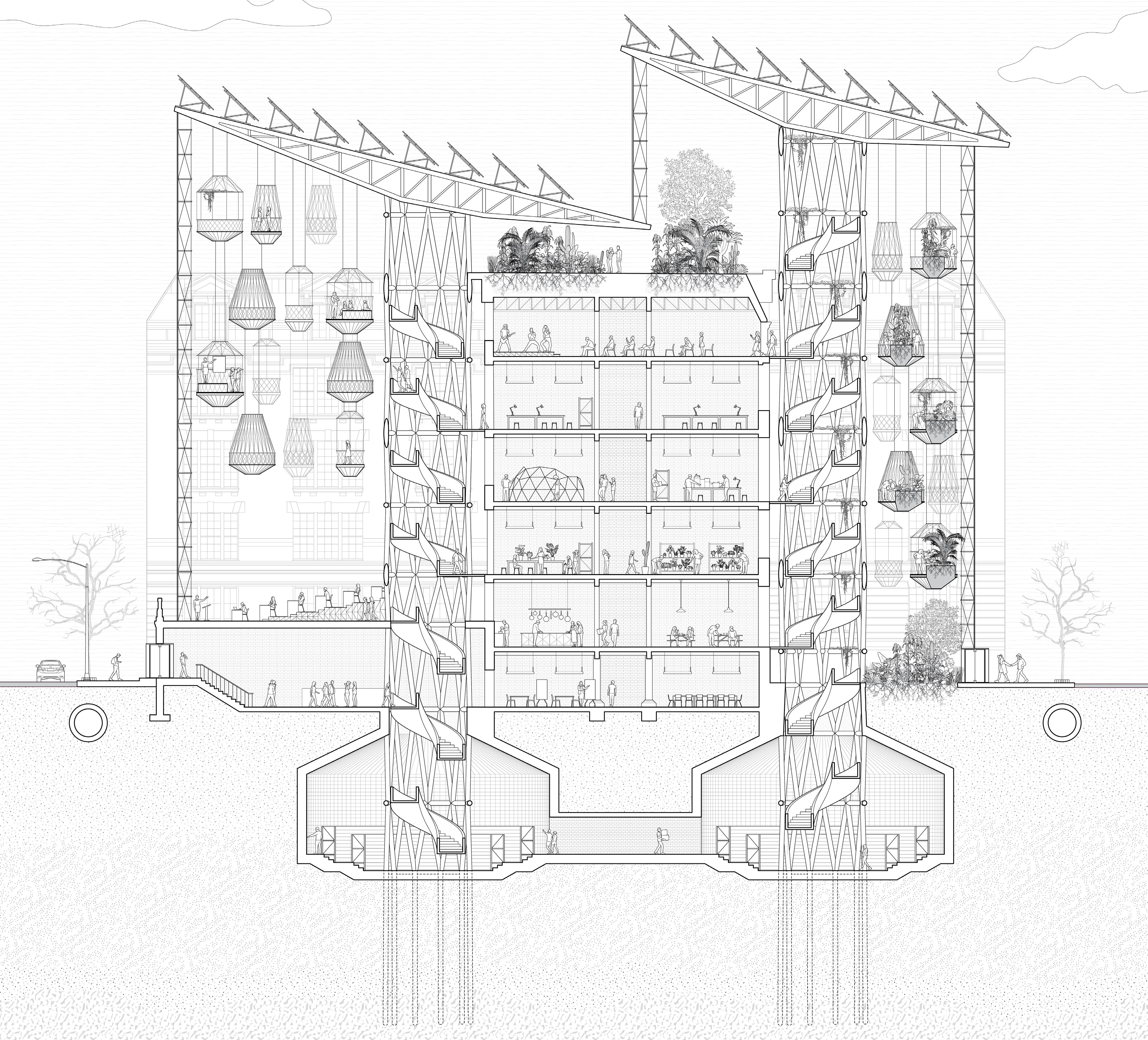 Supported by steel lattice columns that house vertical circulation, the addition is defined by a tapering roof system from which cablewoven garden pods are suspended. Below grade, these columns open up to seed banks, which contribute to the preservation of the neighborhood’s cultural heritage.