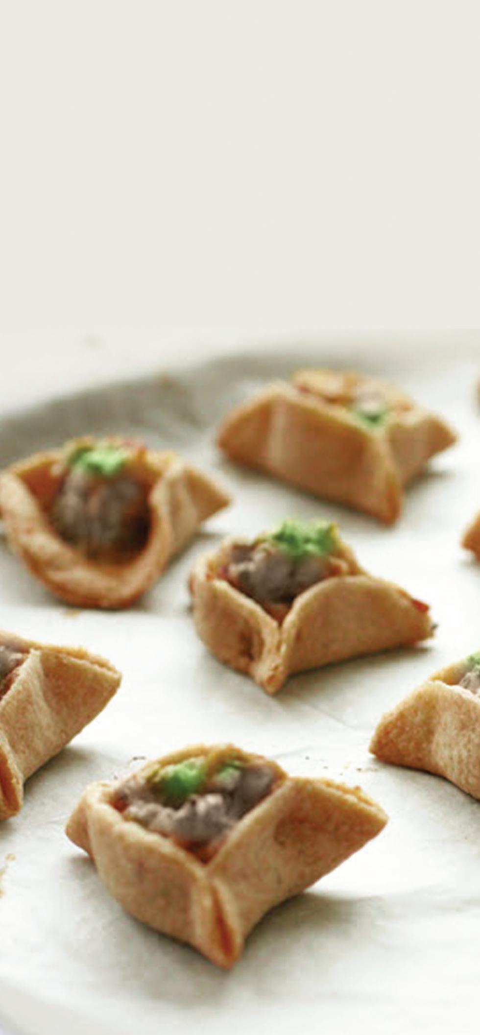 - Au centre de chaque cercle de pâte, étalez une fine couche de sauce pesto et déposez dessus un peu de chaque composant de la garniture. A l’aide de vos doigts, fermez en triangle et serrez bien les bords.