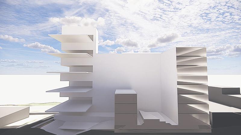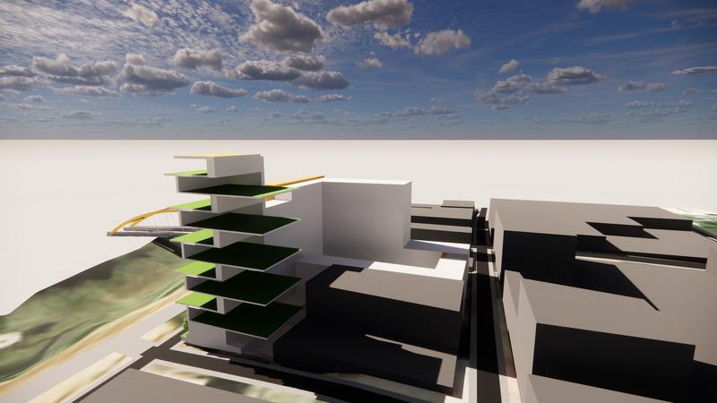 Adición de planos elevados en las terrazas para generar jerarquía de la zona, así como también generar balcones y circulaciones en la edificación.