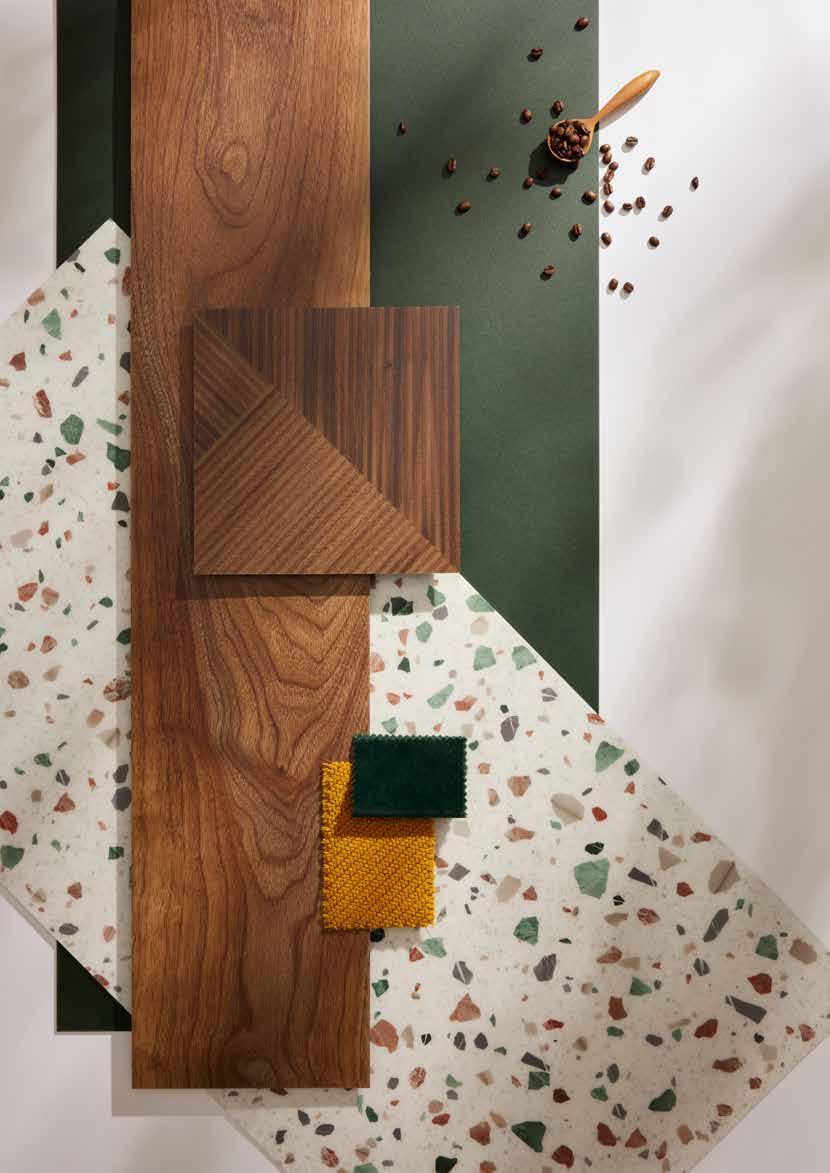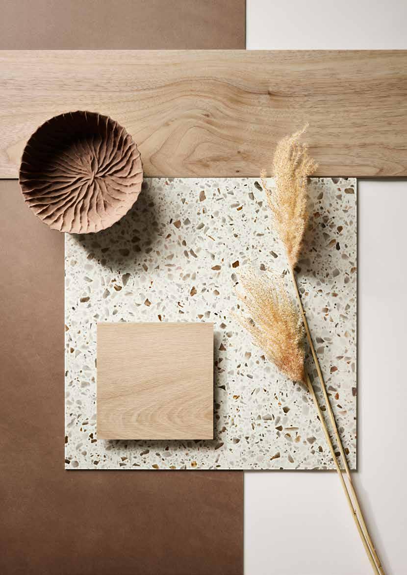 Nach Hause kommen und entspannen? Umgeben Sie sich mit warmen, beruhigenden Farben wie erdigen Braun- und Terra-Tönen und finden Sie inmitten der unendlichen Landschaften der Wüste etwas Ruhe. Oder holen Sie sich einen Hauch dieser endlosen Sandebenen ins Haus mit einem hellen Naturstein oder dezentem Terrazzo in Kombination mit einer verwitterten Holzoberfläche. Ein Hauch von Roségold sorgt für einen Farbtupfer mehr an Eleganz.