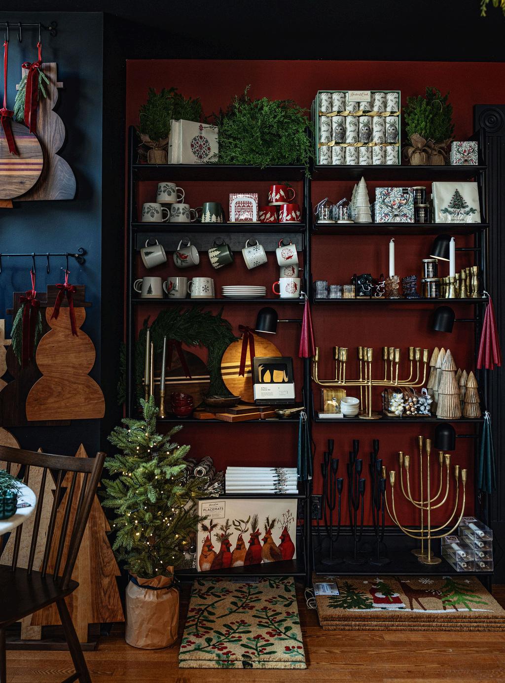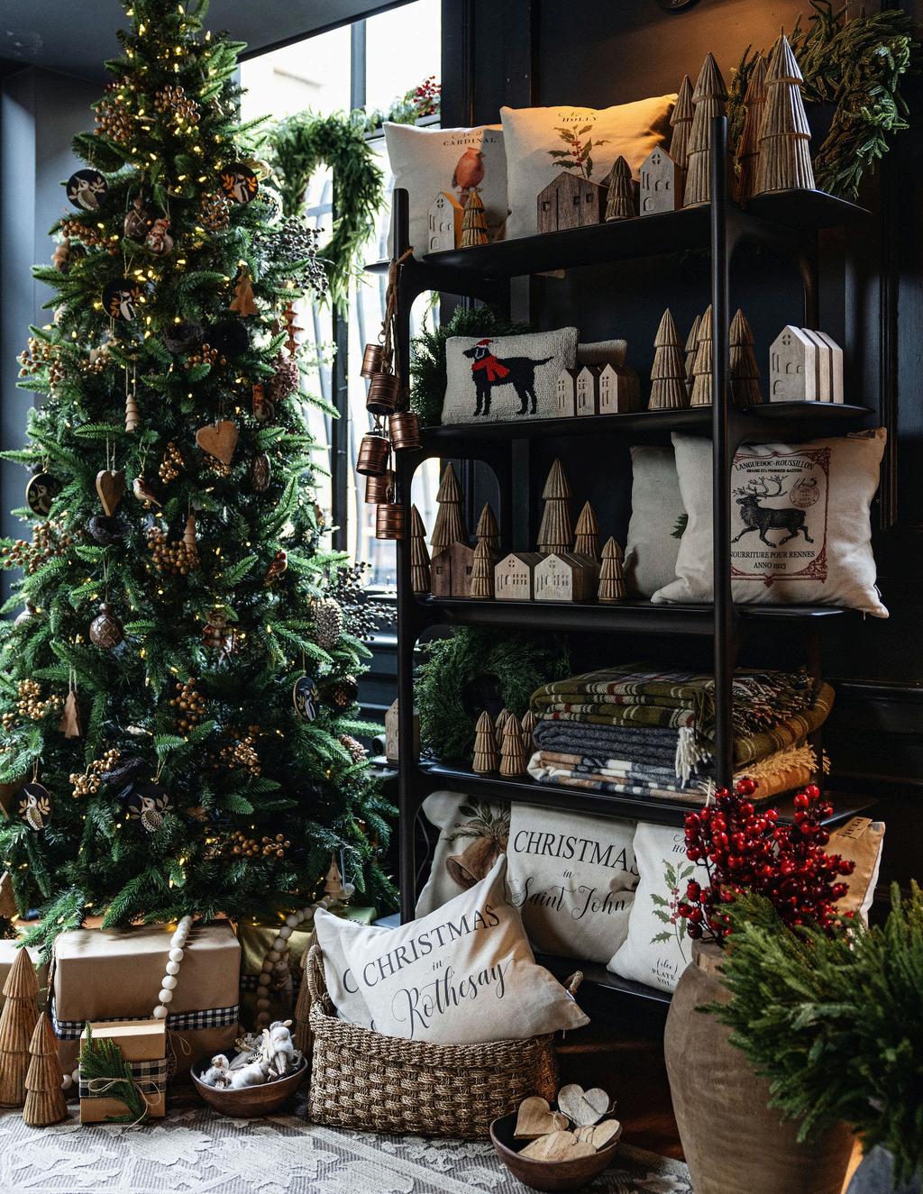 Ourbuildingat115PrinceWilliamStreet still boasts its original façade and the remarkable Corinthian columns that rise through our two-storey showroom. With this year ’ s holiday lookbook, our team wanted to channel that very spirit of discovery and nostalgia: to recreate the magic of stepping into a Victorian mercantile shop, with shelves adorned in garlands, wooden baubles, vintage ornaments, and treasures waiting to be found.