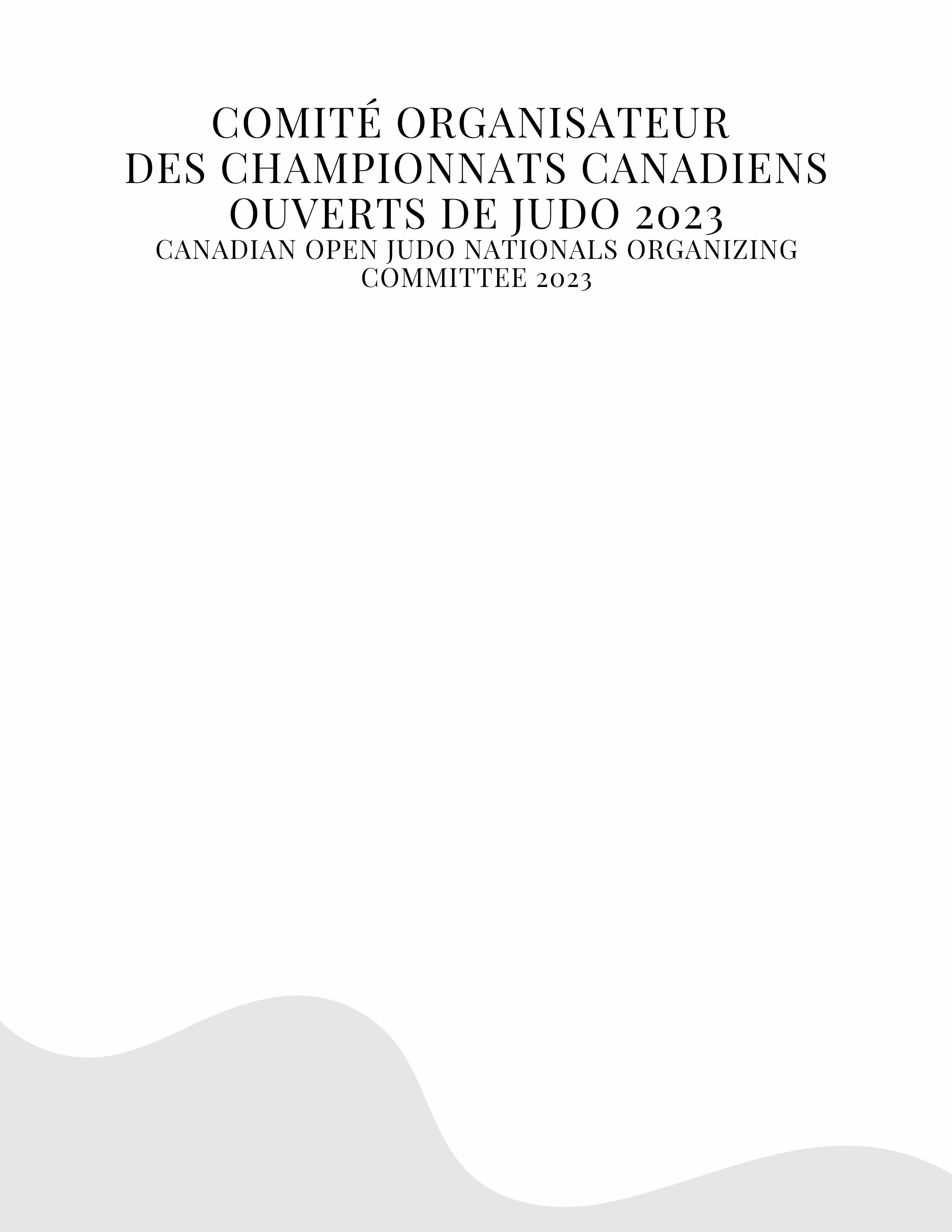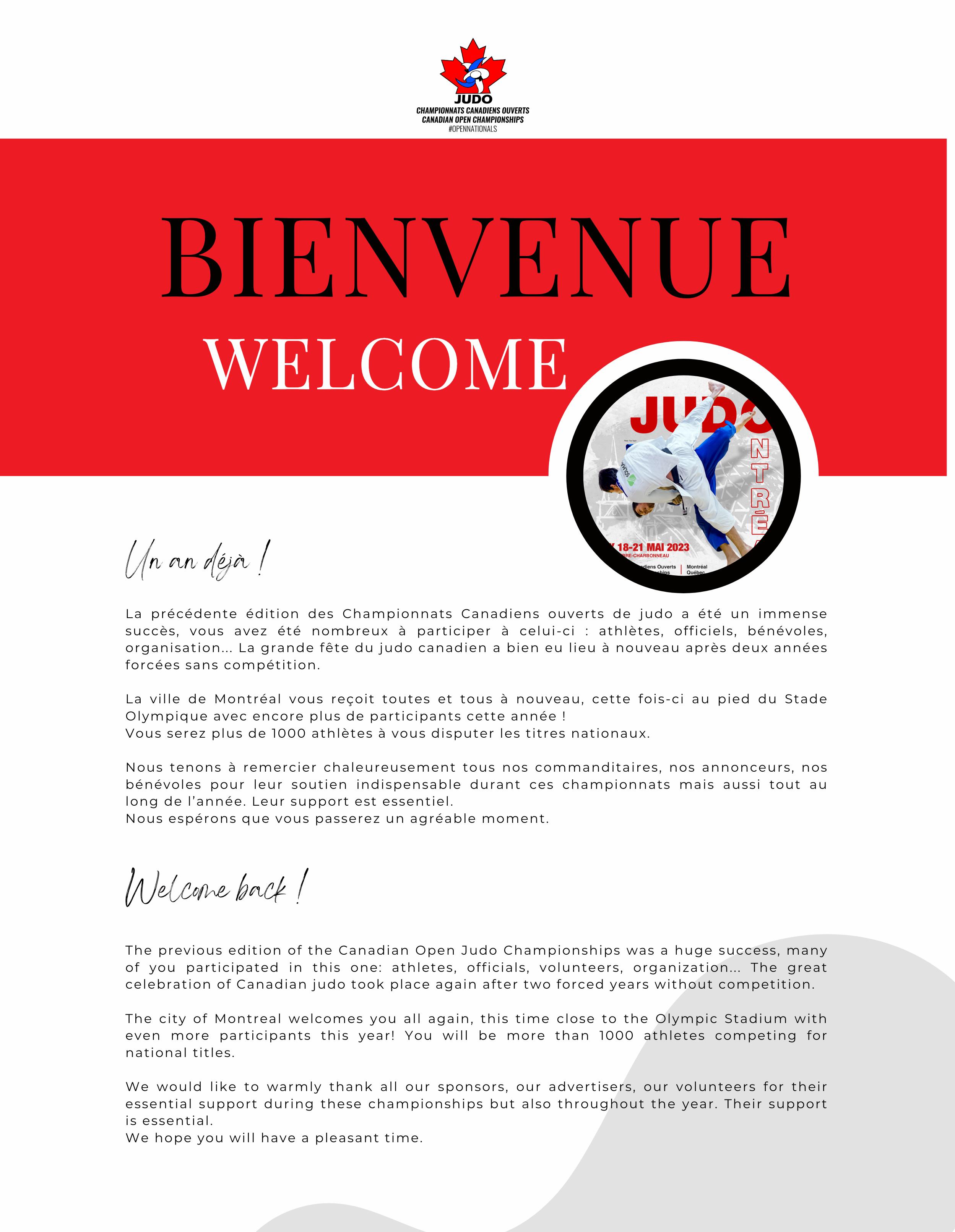 Au nom du conseil d’administration de Judo Canada, nous vous souhaitons la bienvenue aux championnats canadiens ouverts de judo 2023, qui se déroule au Centre Pierre-Charbonneau à Montréal du 18 au 21 mai 2023