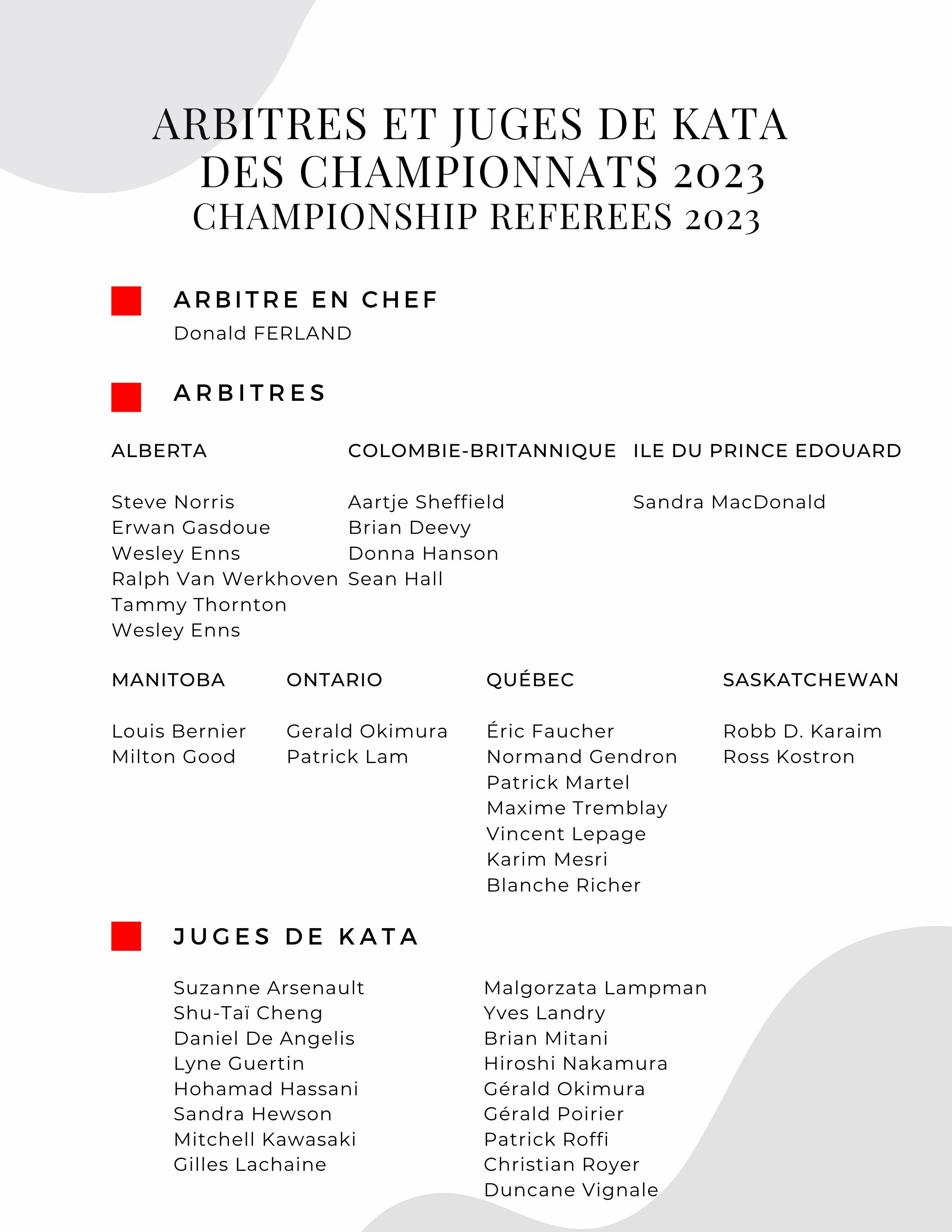 À ceux et celles qui sont nouveaux aux championnats nationaux, nous espérons que vous en garderez de bons souvenirs qui dureront toute votre vie. Aux judokas médaillés provinciaux et nationaux, bonne chance dans votre poursuite de l’excellence. Pour certains c’est le début d’une grande aventure en vue de représenter le Canada aux compétitions internationales. Aux vétérans, nous vous souhaitons bonne chance dans votre quête de devenir champion(ne) national. Aux compétiteurs et compétitrices de Kata, nous vous souhaitons un immense succès.