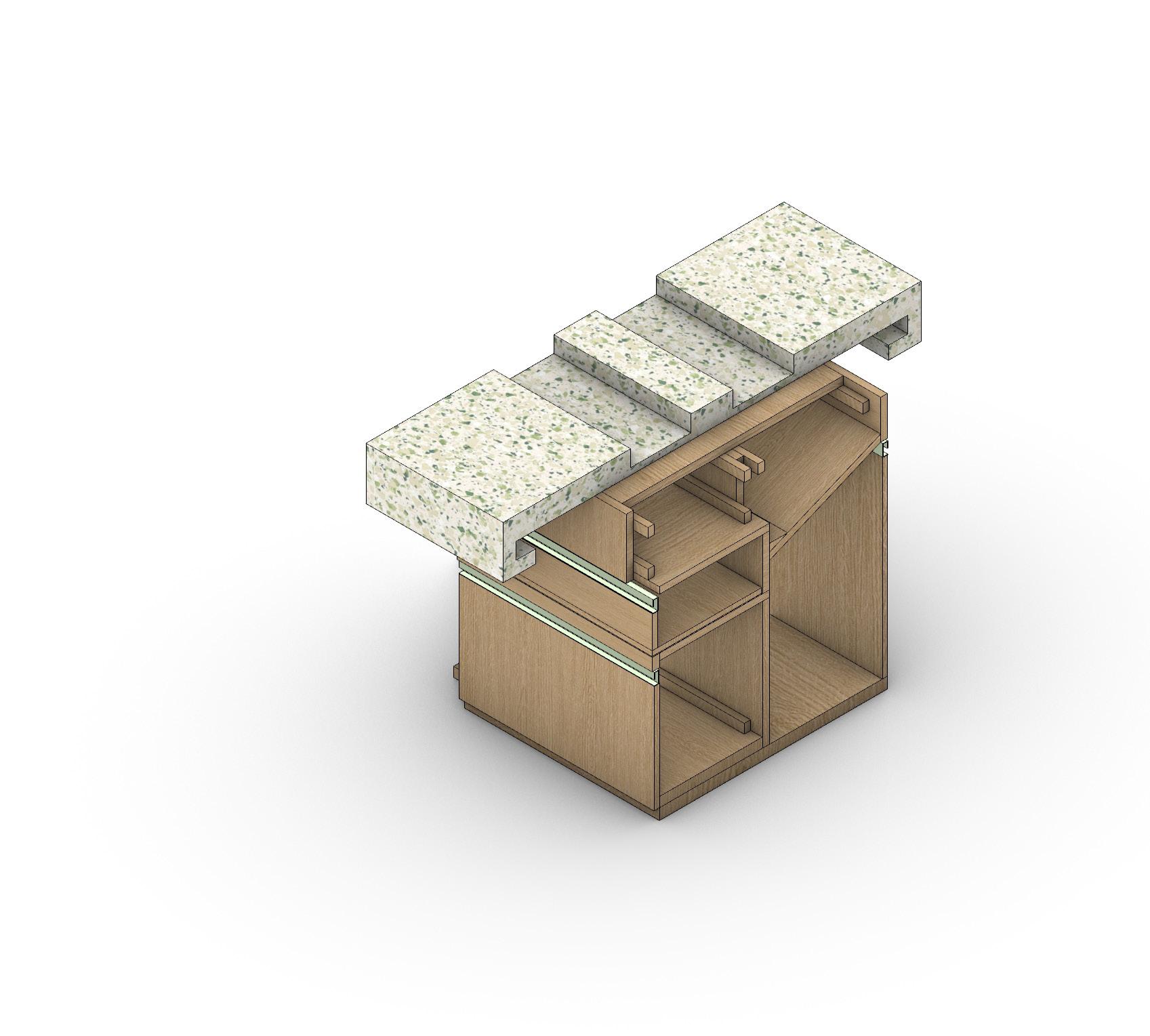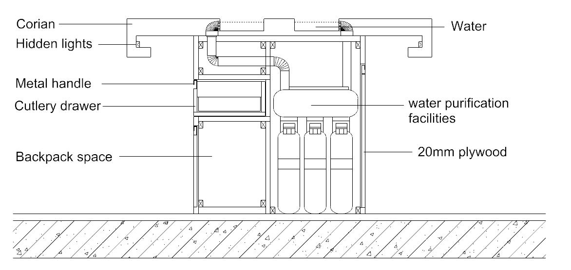 I have arranged the kitchen space in the middle of the entire first floor space, according to the order of cooking and serving. People usually carry their food to the dining table after using the kitchen. This layout allows people to move from the centre towards the outside.
