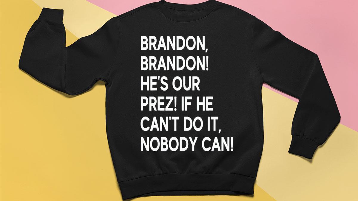 BRANDON BRANDON HE'S OUR PREZ IF HE CAN'T DO IT NOBODY CAN T-SHIRT T-SHIRT Shop our exclusive "Brandon Brandon He's Our Prez If He Can't Do It Nobody Can TShirt" and show your support! High-quality custom-printed t-shirt for true fans. To-Tee team of artists will turn any idea, picture, or logo into custom t-shirts! Design consultation, custom design, and revision are included. Contact: support@to-tee.com BUY IT HERE