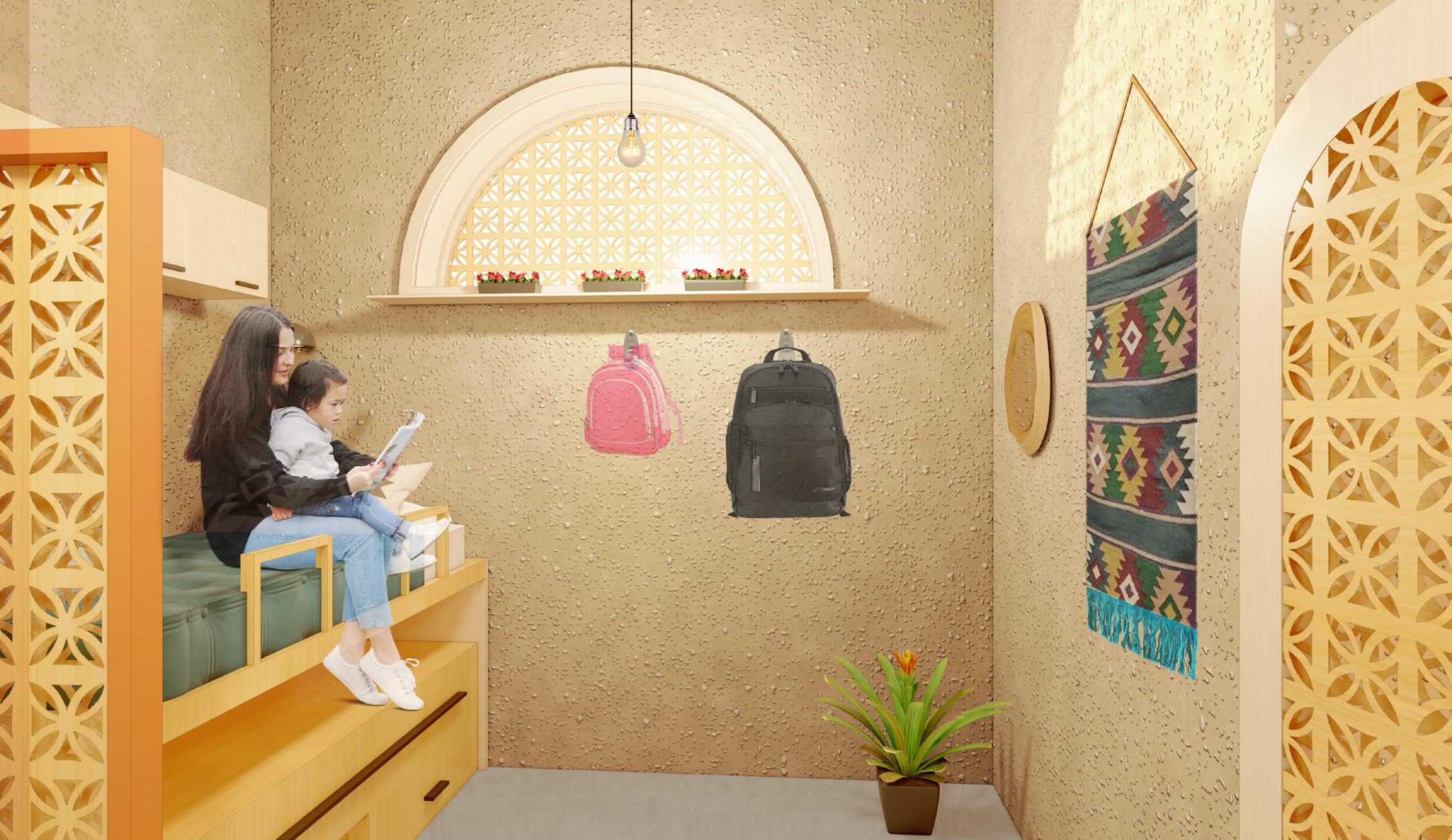 This shelter has moveable lattic screens in order to create an adaptable environment, visual transparencies that connect the spaces, and proper air flow. Additionally, it uses local materials for affordability and sustainability purposes.