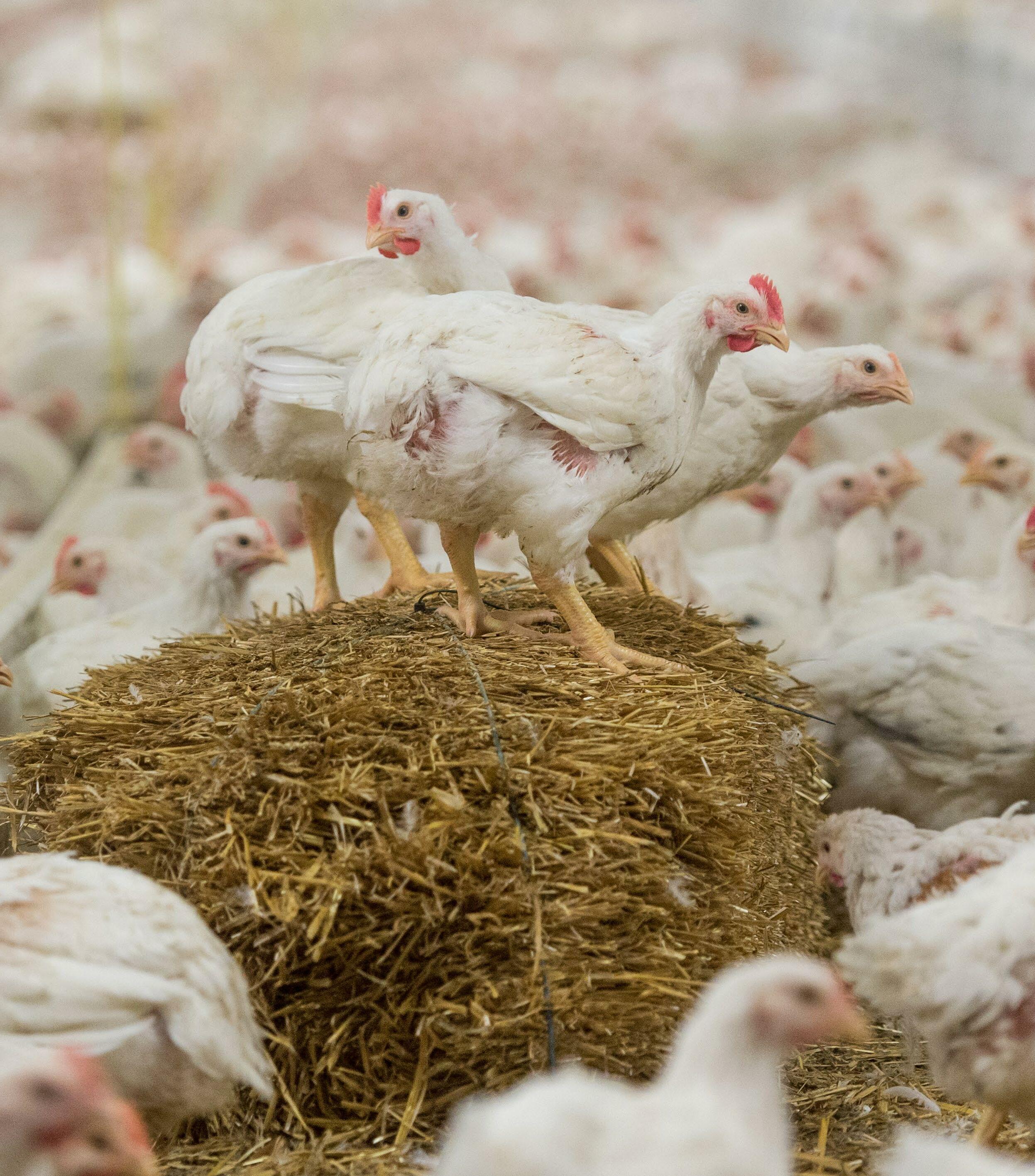 • Masthühner leben in riesigen, unstrukturierten Hallen, oft ohne Tageslicht in großer Enge