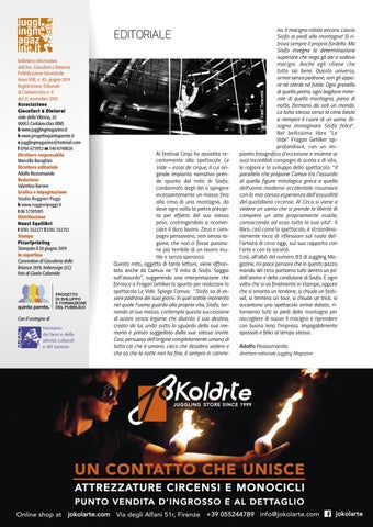 bollettino informativo dell’Ass. Giocolieri e Dintorni Pubblicazione trimestrale Anno XXII, n. 83, giugno 2019 Registrazione Tribunale di Civitavecchia n. 9 del 21 novembre 2002 Associazione Giocolieri & Dintorni viale della Vittoria, 25 00053 Civitavecchia (RM) h www.jugglingmagazine.it h www.progettoquintaparete.it e jugglingmagazine@hotmail.com f 0766 673952 m 340 6748826 Direttore responsabile Marcello Baraghini Direttore editoriale Adolfo Rossomando Redazione Valentina Barone Grafica e impaginazione Studio Ruggieri Poggi h www.ruggieripoggi.it t 06 57305105 Distribuzione Nuovi Equilibri t 0761 352277 f 0761 352751 Stampa Pixartprinting Stampato il 20 giugno 2019 In copertina Convention di Giocoleria della Brianza 2019, Imbersago (LC) foto di Giada Calamida