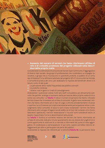 Considerando la definizione di comunità del bando Open Community (“aggregazioni di diverso tipo sociale, dai gruppi di professionisti che condividono un impegno lavorativo, a gruppi che si riconoscono in specifiche pratiche, ai pubblici di un certo tipo di iniziative”) e le definizioni adottate dal progetto QP>CC di comunità territoriale e comunità di pratica del circo, per analizzare le risposte dei beneficiari diretti si è tenuto conto di dati quali: ● La percezione della realtà frequentata dai pubblici coinvolti ● Le pratiche condivise ● I diversi ruoli in gioco e i livelli di coinvolgimento Analizzando i questionari online rivolti allo staff e al pubblico più attivamente coinvolto dai partner, emerge un aumento della percezione della propria realtà di circo come una comunità. La Tabella 7 indica il numero di persone che hanno utilizzato termini chiave che rimandano ad un’idea di comunità. In giallo sono evidenziati i termini che fanno riferimento ad un tipo di luogo o attività prevalentemente circense o sportiva, la cui fruizione non implica necessariamente partecipazione attiva o coinvolgimento nella comunità. In azzurro sono invece evidenziati i termini che fanno riferimento allo sviluppo di legami sociali aldilà e al di fuori del contesto circo (corsi, laboratori, spettacoli). I termini “associazione” e “scuola” sono considerati neutri, in quanto rispecchiano forme e denominazioni istituzionali. La Tabella 7 illustra un aumento relativo dei termini che fanno riferimento ad un’idea di comunità, indicativo di uno spostamento da una visione dei luoghi di circo come opportunità di usufruire di un servizio a riferimenti dal punto di vista aggregativo, di condivisione e partecipazione. A sua volta, questo potrebbe indicare atteggiamenti più attivi e partecipativi da parte dei pubblici. Analizzando le risposte dei referenti per le attività (Tabella 8), la percezione della QUINTA PARETE > CIRCUS COMMUNITY FARE RETE CON IL CIRCO PERCORSI E RIFLESSIONI 2019>2020