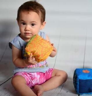 Cubo de 14x14x14 cmts, con figuras para estimulación sensorial, fabricados en jersey de seda estampada, con sonidito.